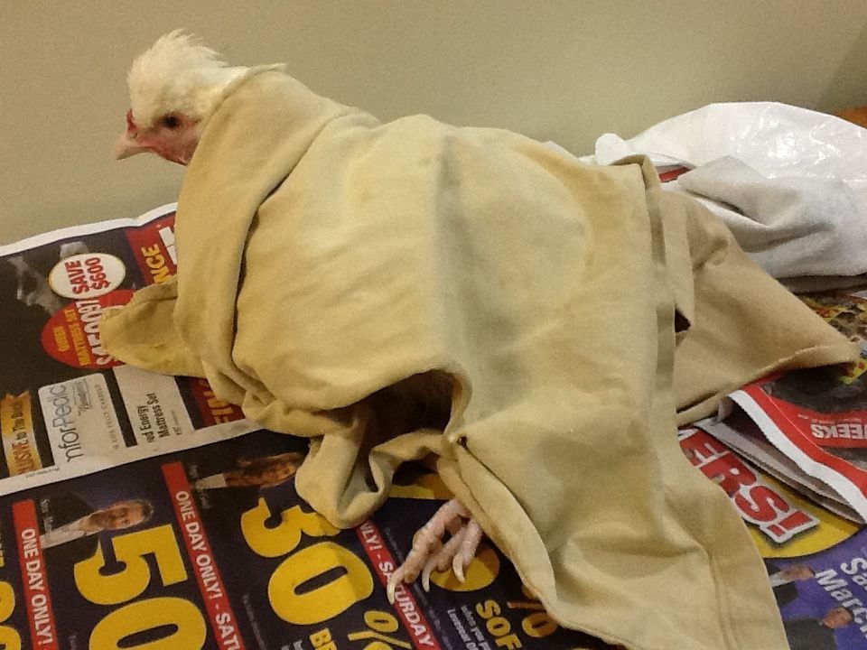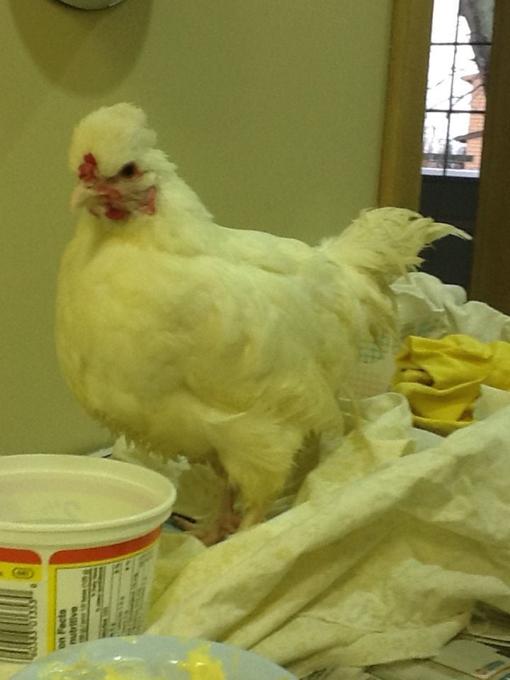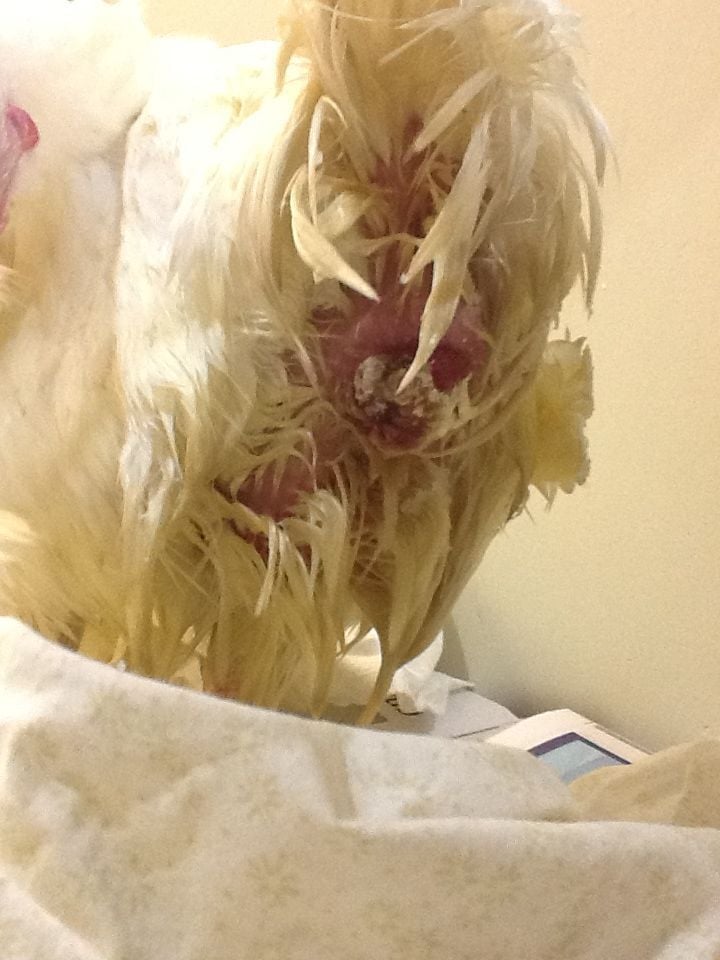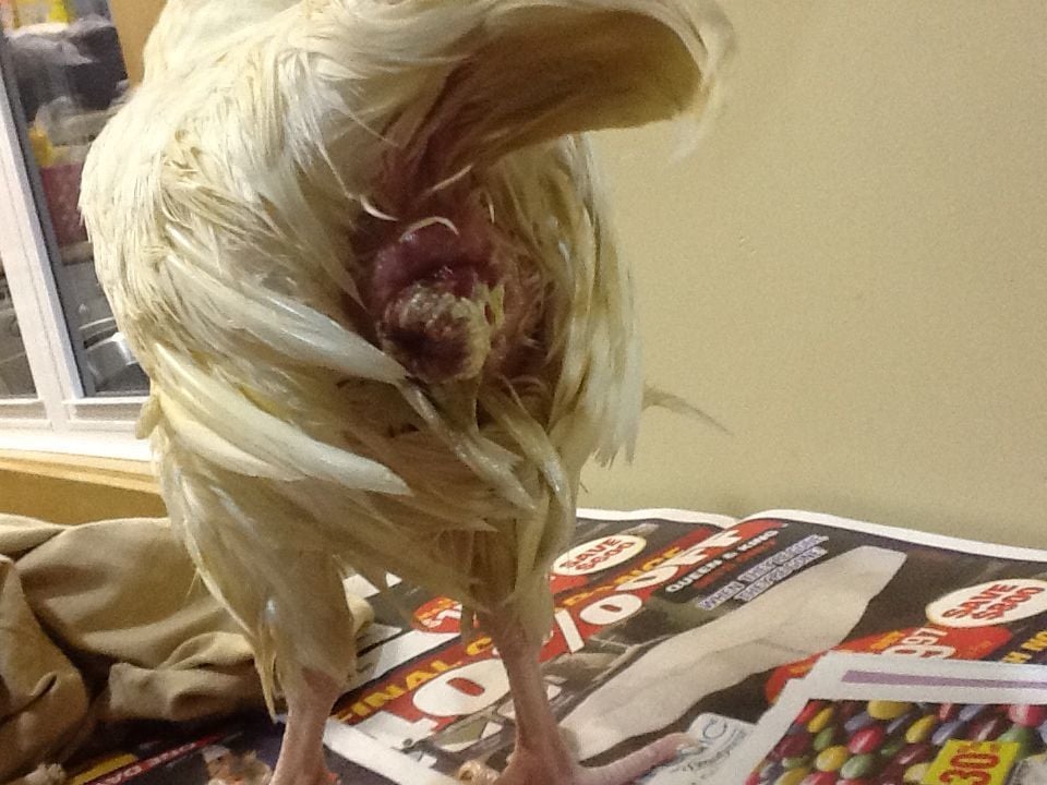 We tried to bathe her this afternoon. I put on gloves and kept pouring warm water over the area. There appears to be a crust over the top of the prolapse which we didn't get off, even with soaking. I poked the area, thinking I would feel a bulge or hard spot if she was eggbound.... but I don't know what to look for. The area seemed soft and I couldn't feel anything like an egg. The hen is still relatively perky after over 24 hours - could she still be eggbound? I then sprinkled sugar over the prolapse and dried the hen. After we washed her, she wanted to peck near her tail area. Not sure what to do next.
