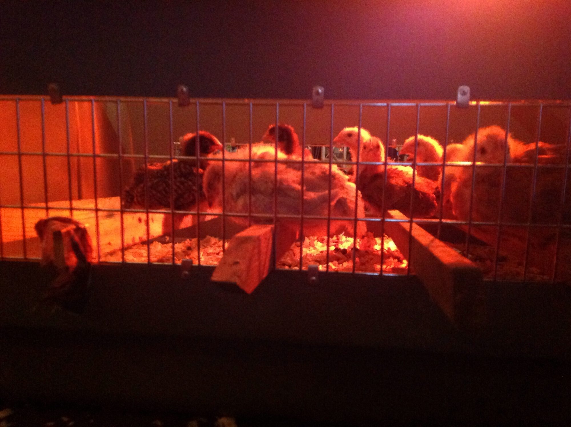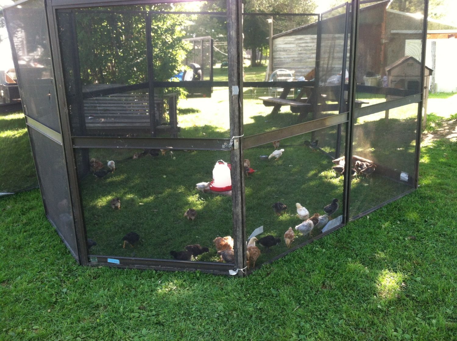 We stuck these tomato stakes in the brooder at probably 5 or 6 days old...and they've been using them ever since! So darn cute! Not the best pictures...but I love seeing them all tucked in! I've been having them out for a few hours a day in a big screened in porch over grass when I get home from work and they LOVE if! Tires them out...just like puppies