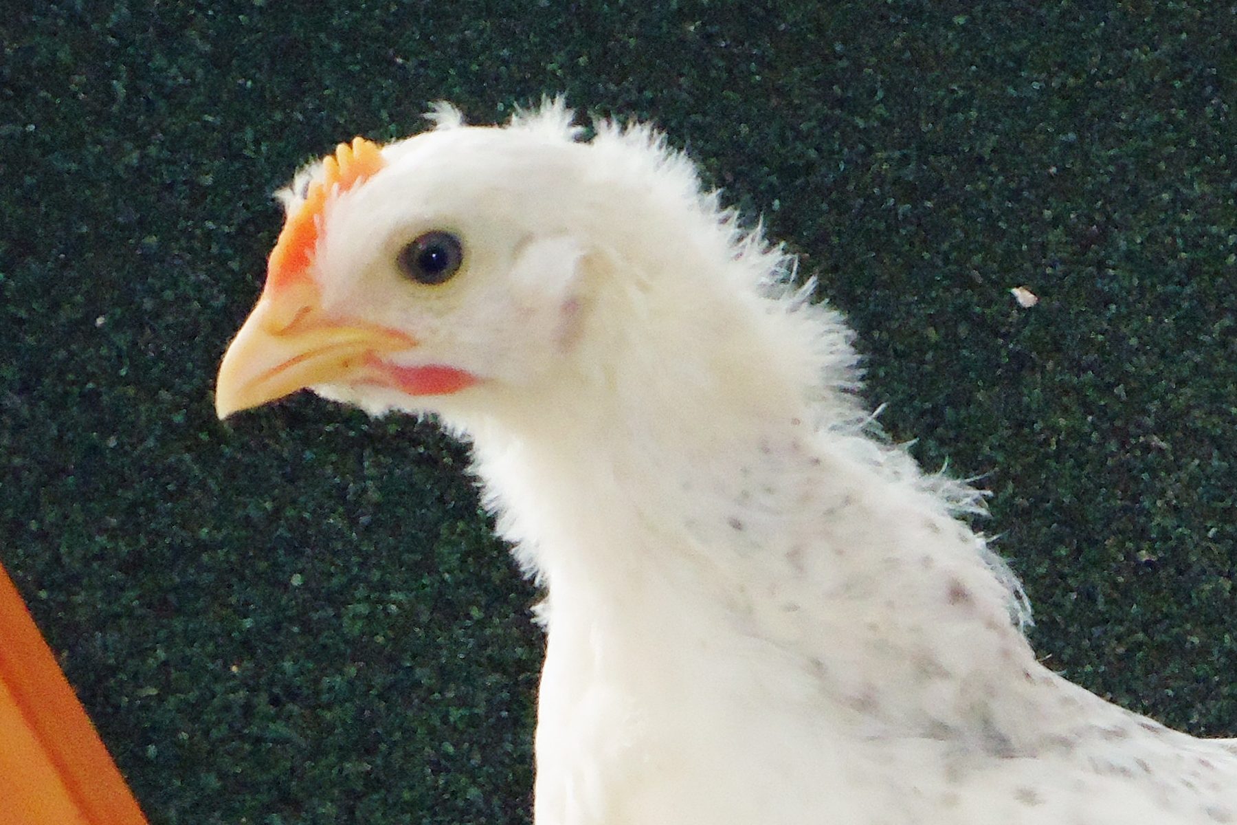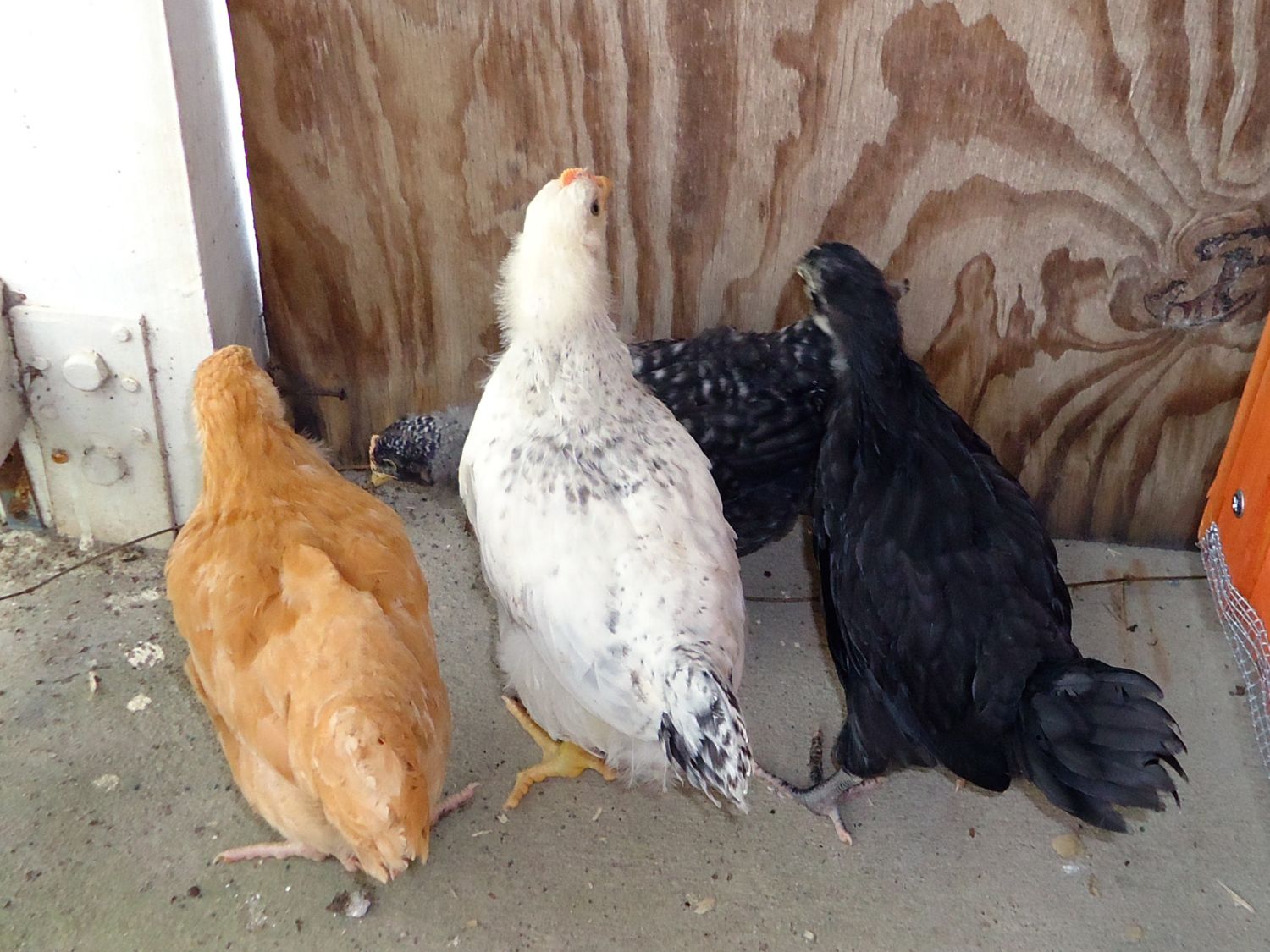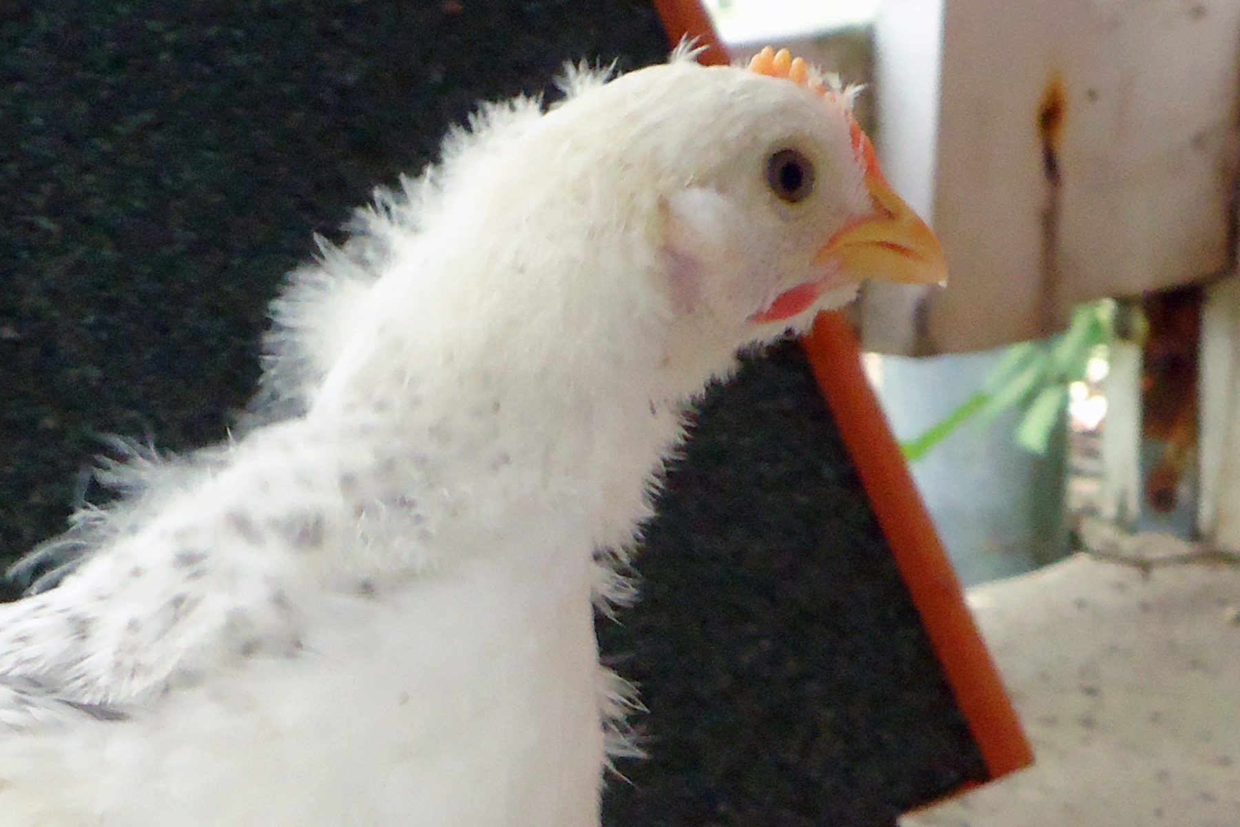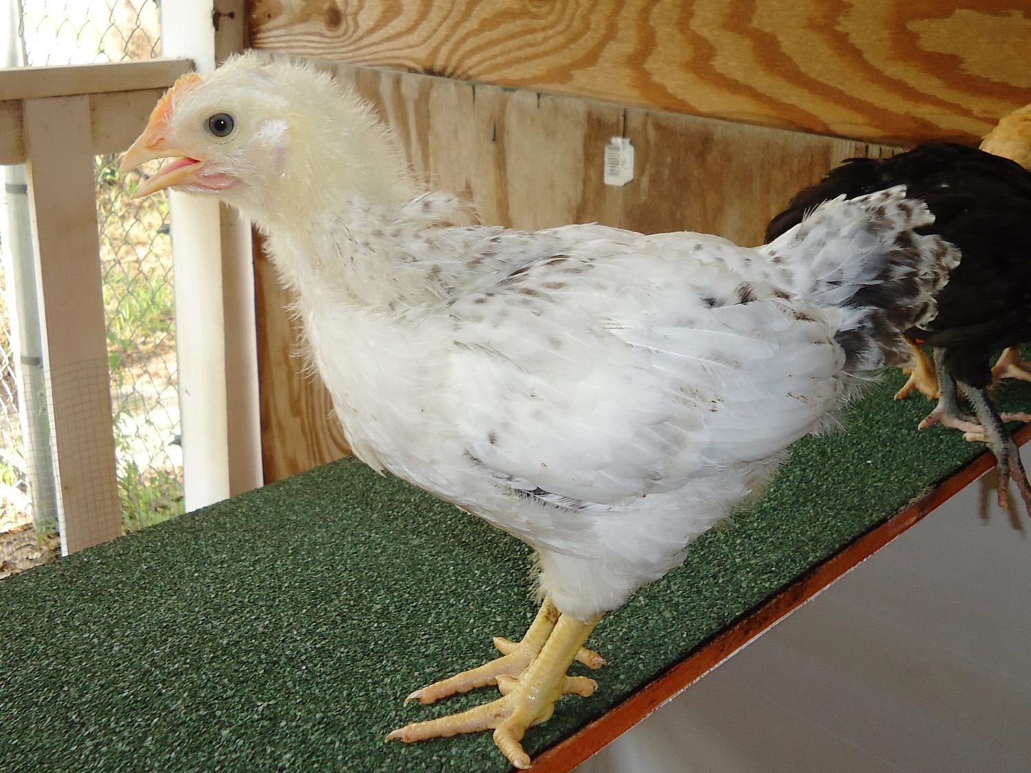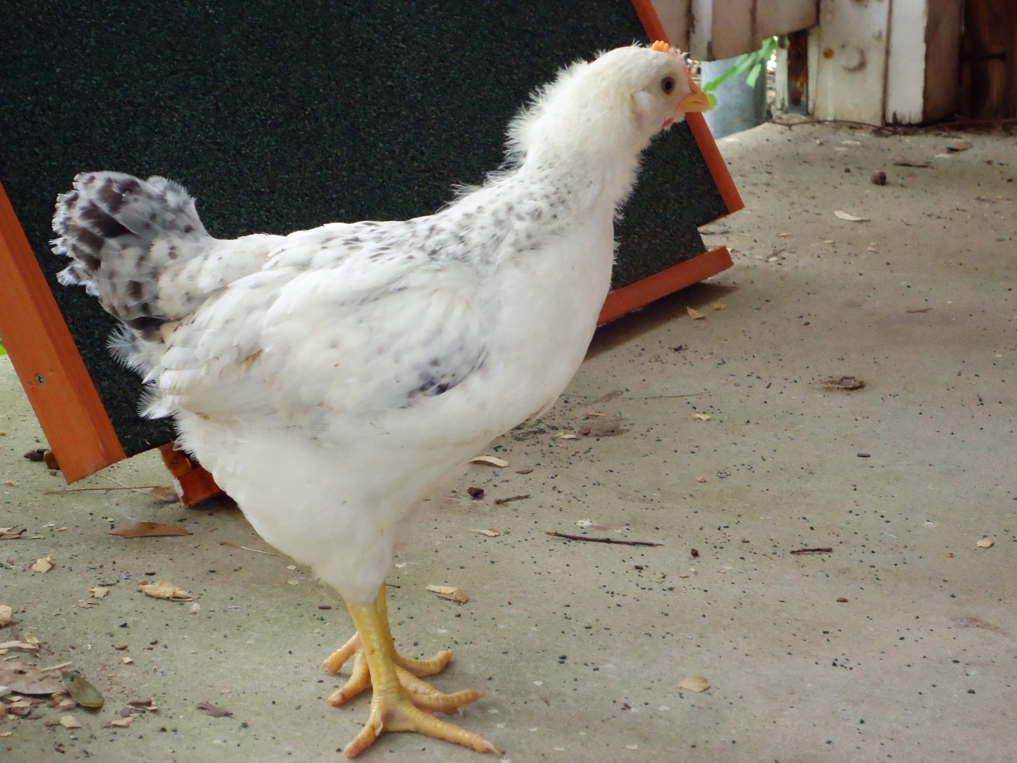 She (or maybe he) has been starting to almost-cluck from time to time for the last week and a half. No crowing, but nobody else is clucking yet...