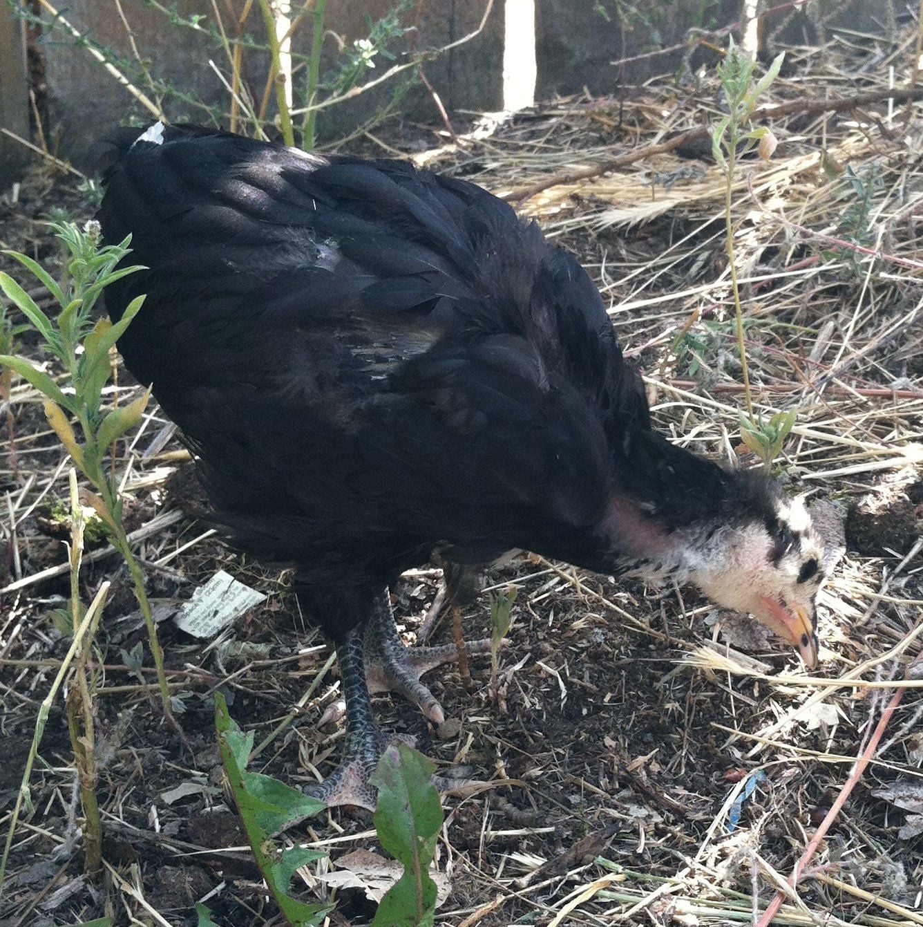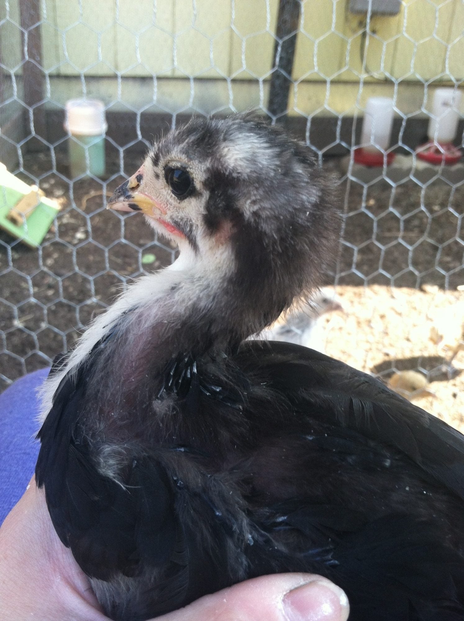 I'm thinking this is a boy. 5-6 weeks old. All my other girls have nice fluffy tail feathers. This one is just rump. Also, he/she is practically bald. Feathers are growing in veeeeery slowly. Sad to say, I wouldn't mind if it turns out to be, this is my least favorite. Hates people. Screams bloody murder if you go near it. Not what I thought an Australorp would be like.