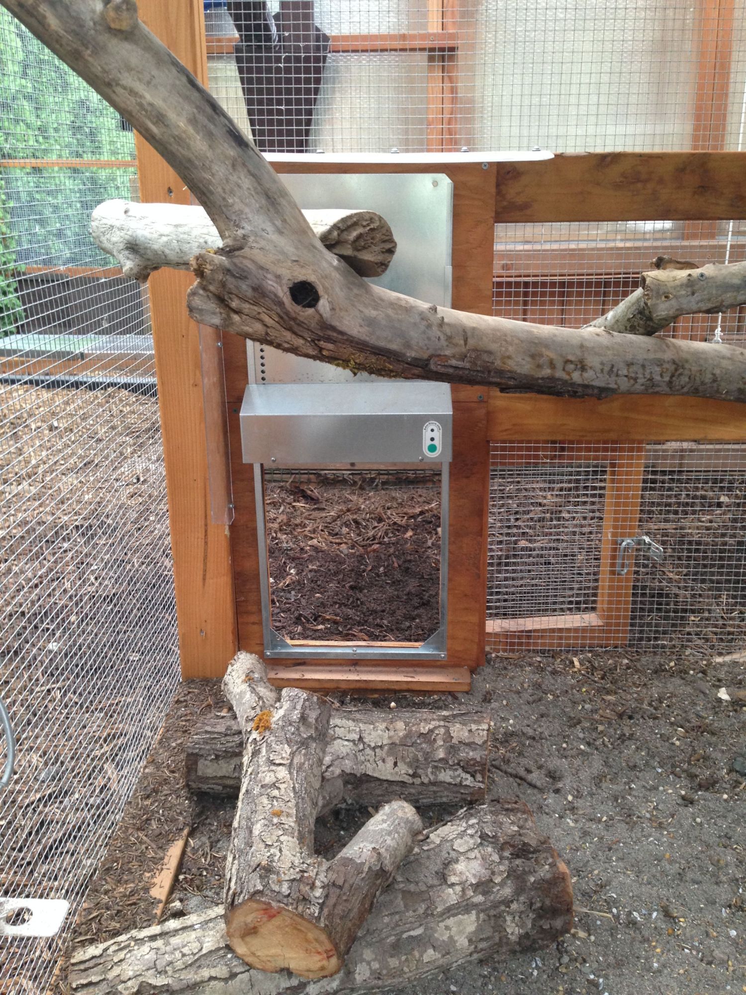 I think either one would work (and a few others out there). I have the Ador1 and am also in the PNW. Its light sensor is very sensitive, it does not close until it is REALLY dusk. I programed it to add the 'Last Call' option (both the Pullet door and the Ador1 have this option). My chickens are well on their roosts before the door closes. My door is installed inside the run area, as it is secure. I wondered if I would need to use the additional light sensor in this location, but the one on the door itself is plenty sensitive. I chose the Ador1 because my location would have made a swinging door awkward (I won't admit to being clumsy, but I could see myself dashing around the corner right into it. :barnie ). Here is a pic of mine: It works SO well, and what peace of mind! Whichever one you chose, you'll love it.