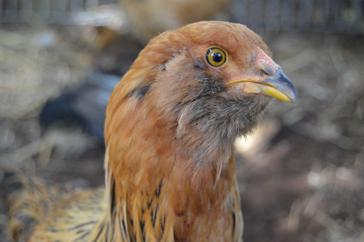 Brown red Modern Game bantam pullet, Coral, Watcher's sister. Six months old August 2. Both are very gentle birds.