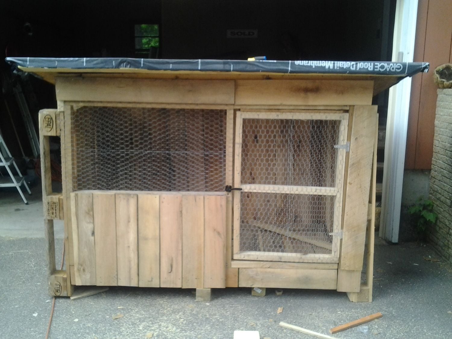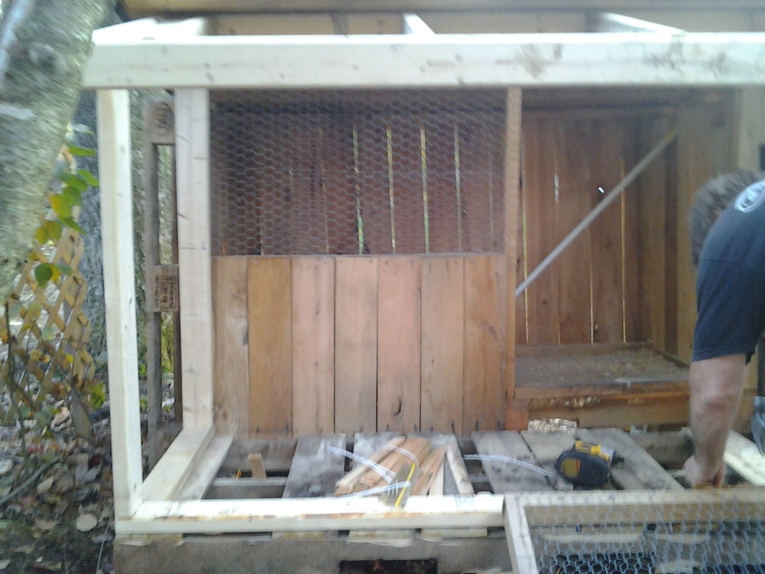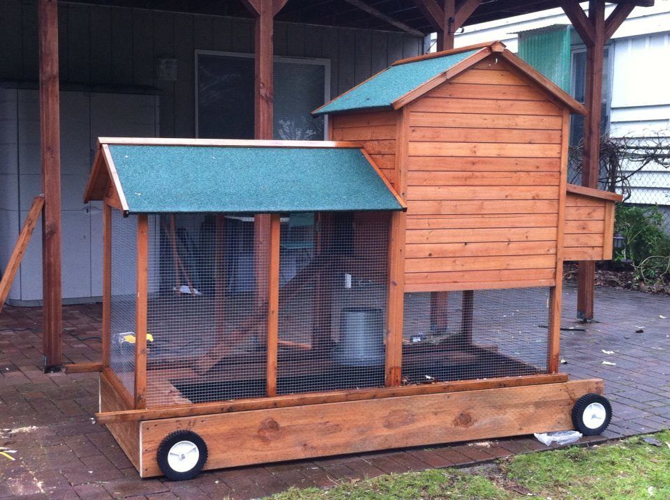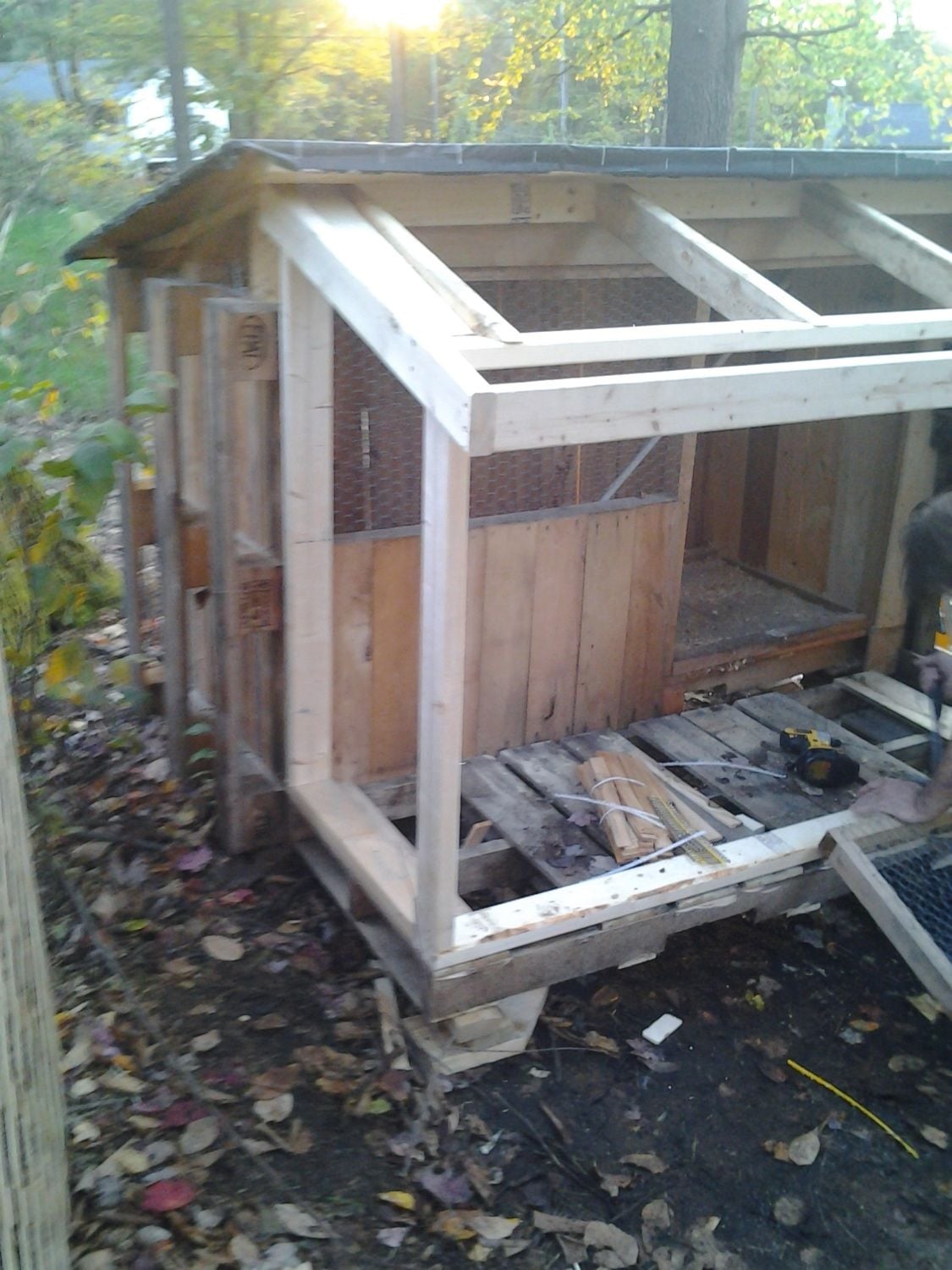 I guess I do have this picture on my phone: This is just with the height addition and wheels added on. The door isn't on the left end yet and the floor isn't installed yet. There is a wall on the left side of the coop, inside the run, I wasn't sure if I was going to remove that or leave it. I could make the original door bigger without affecting the structure, I think.