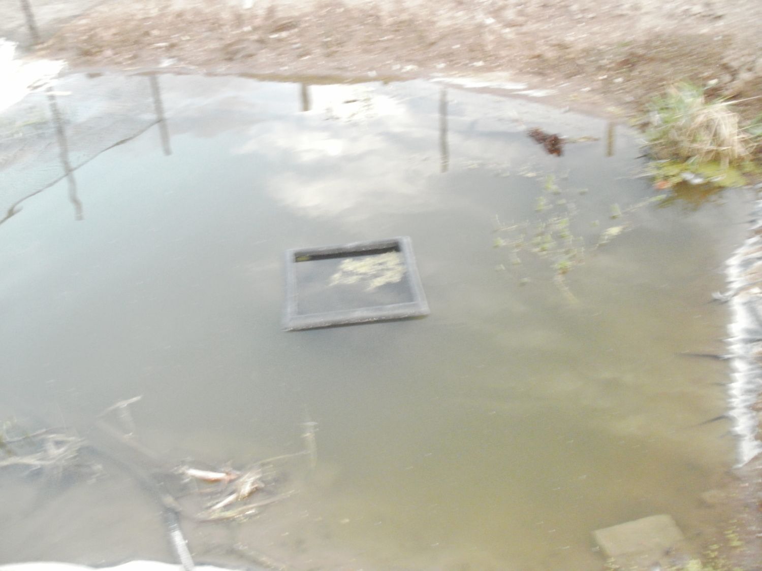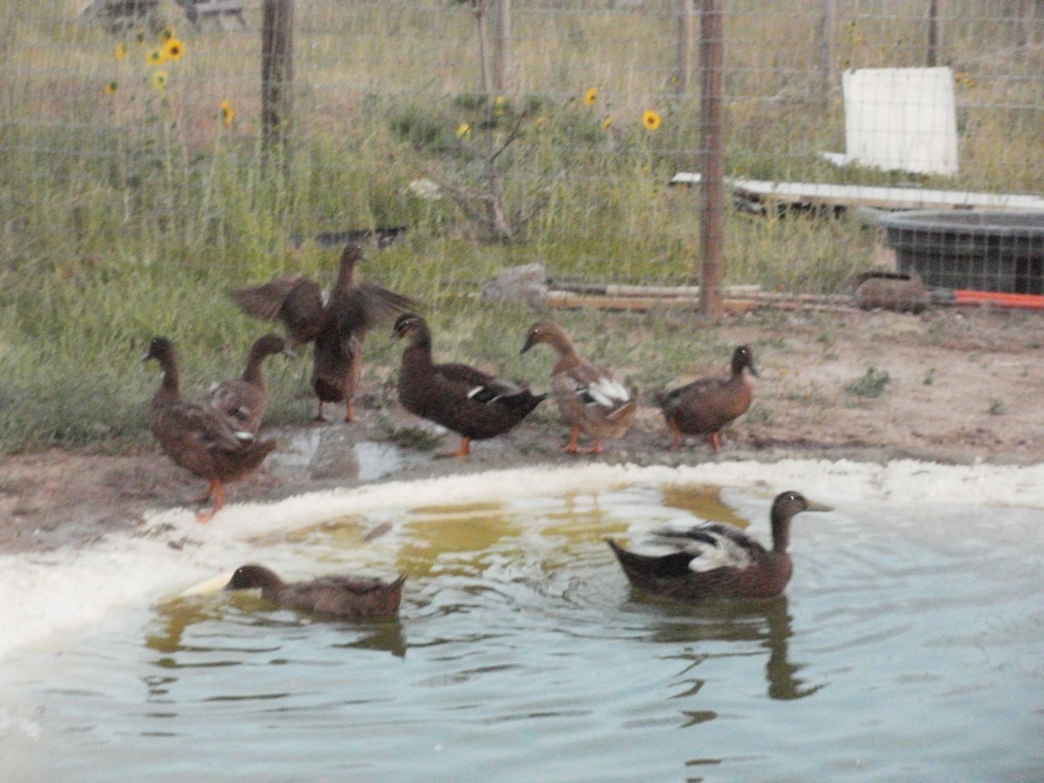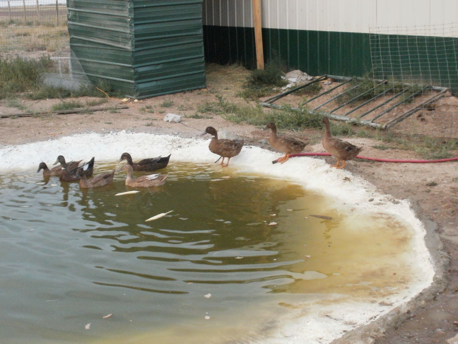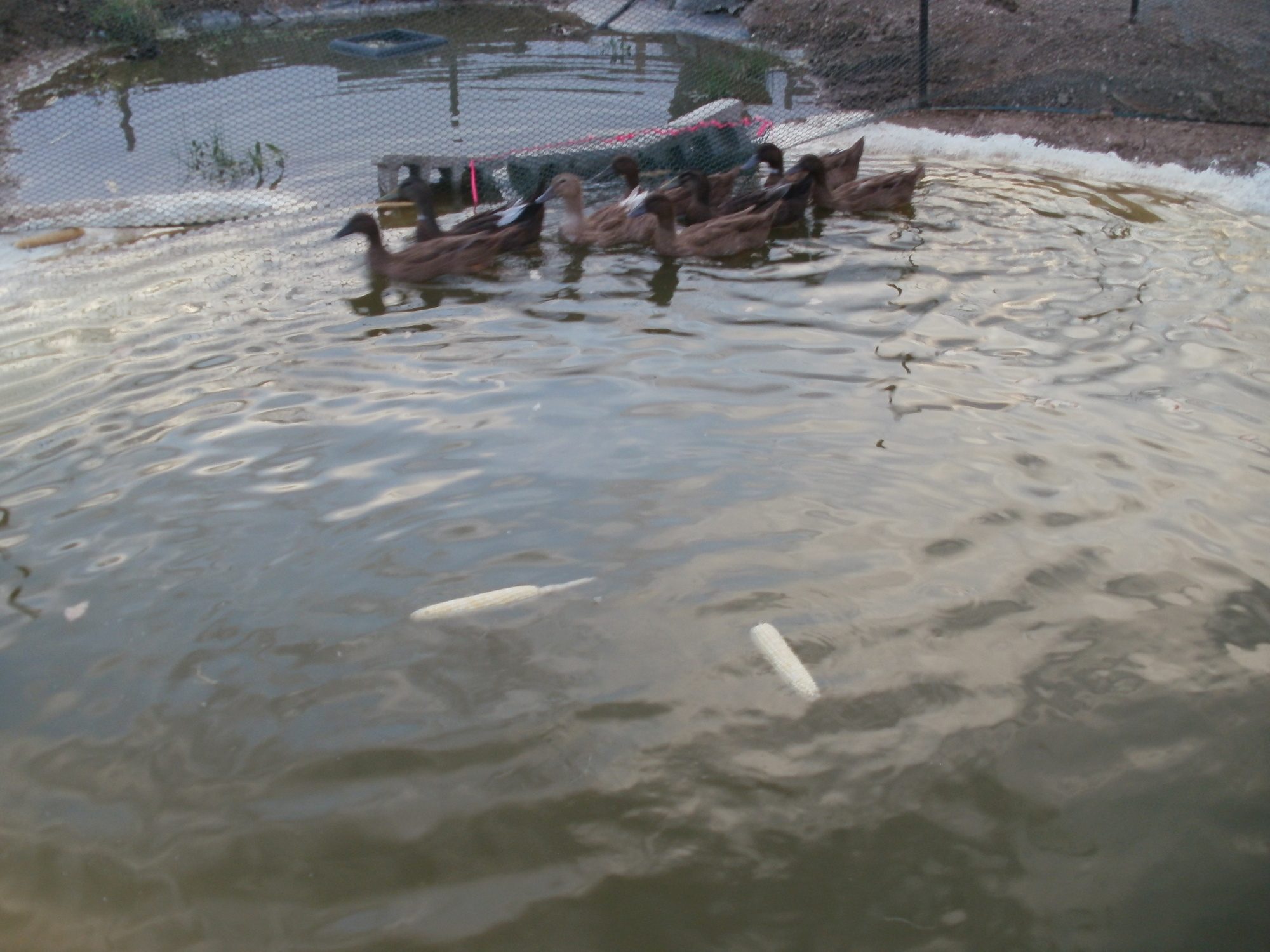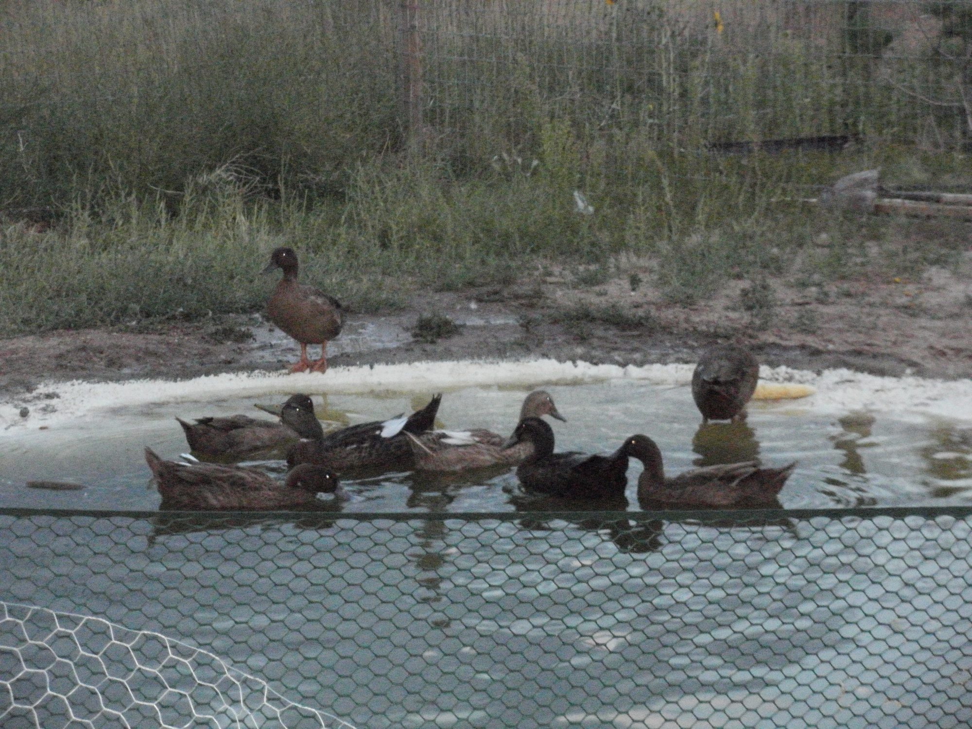 You can see the corn treats I have floating around. Just threw in some fresh ones. Also see the cinder blocks I had to put up to keep the ducks from diving under the fence and eating the plants.