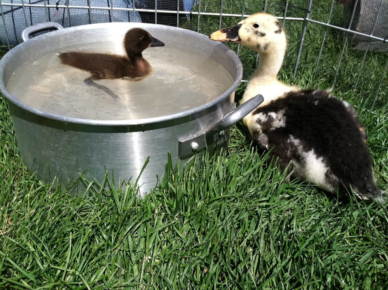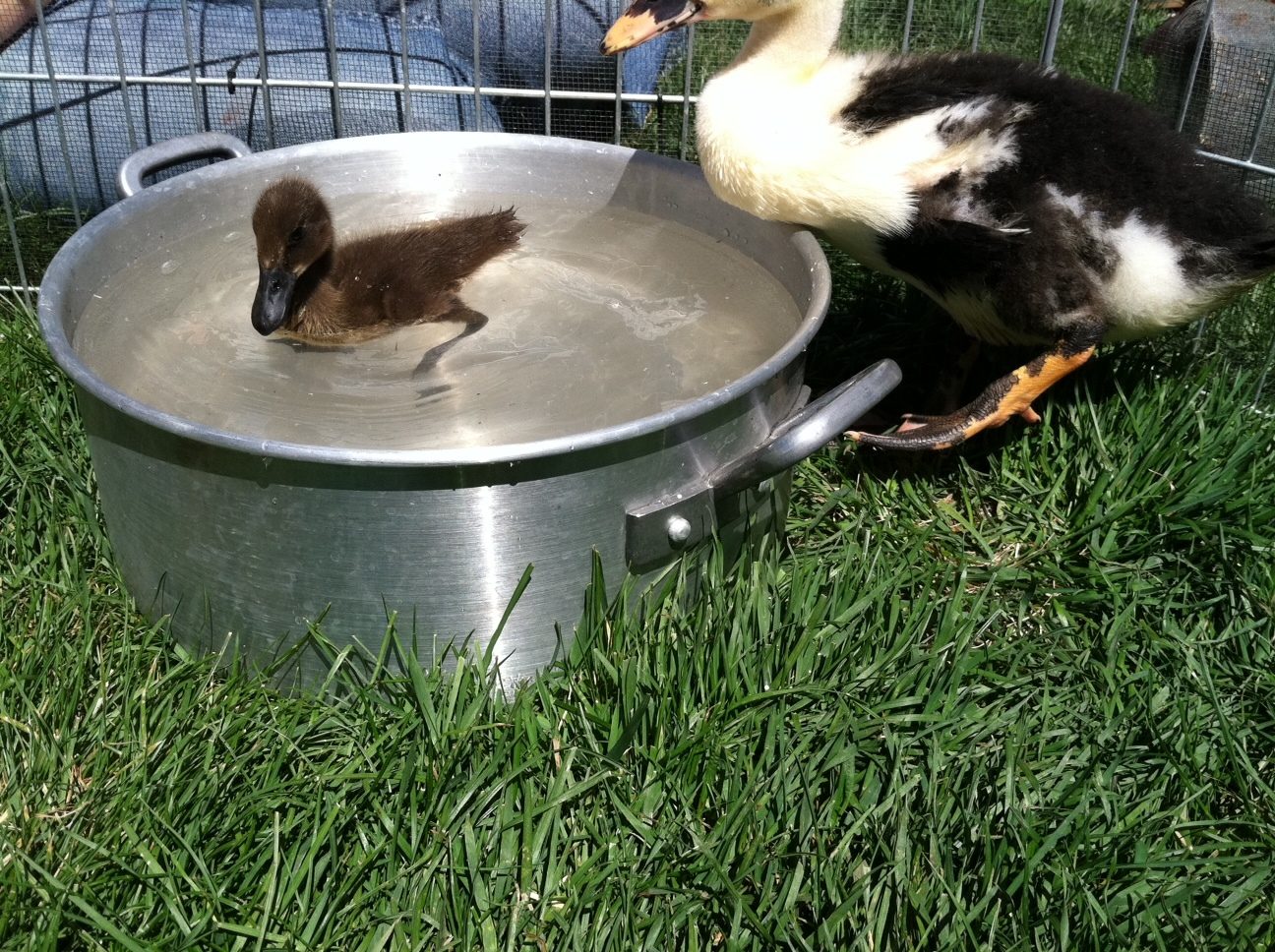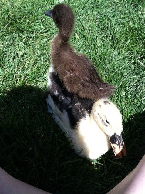 I got such a kick, and a good laugh out of this thread that i had to join you all. I'm pretty new to ducks-I've had them for about two months now. I had a mallard, and a Rouen which I ended up selling so now I have 2 Anconas, and 1 Chocolate Indian Runner. My Anconas are about 4 weeks old, while my runner is only two weeks I think. Because of their size difference they're only together when I'm watching them... Today I let the Ancona's play outside while it was nice, and a while later I let my runner come out to see the "big kids". She looks up to them like a younger sibling would-and doesn't want to be left out! The Ancona's were spooked a little which sent them running. Well, my runner was NOT going to be left behind! It was the cutest thing to see her little feet waddling as fast as they could go!