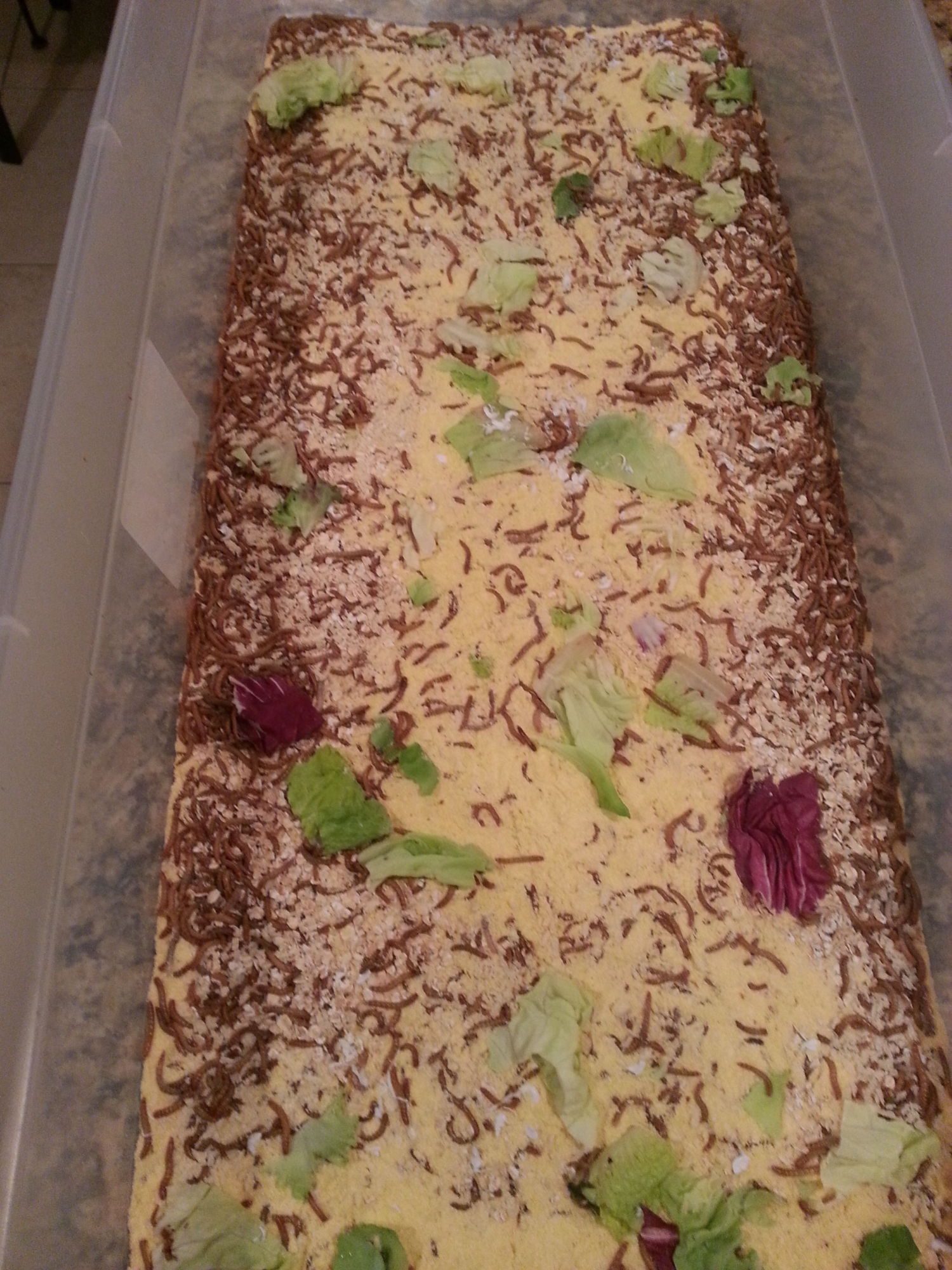 Potato was the choice of food, along with oatmeal/cornstarch combo for bedding. My buggers would lay eggs on the bottom of the plastic drawer, so transferring eggs was a sinch. Just remove live into a drawer to keep producing and dead adults to the jettison pile ( bowl for chickens) from the drawer after a week and move into the "eggs" portion of the shelf.