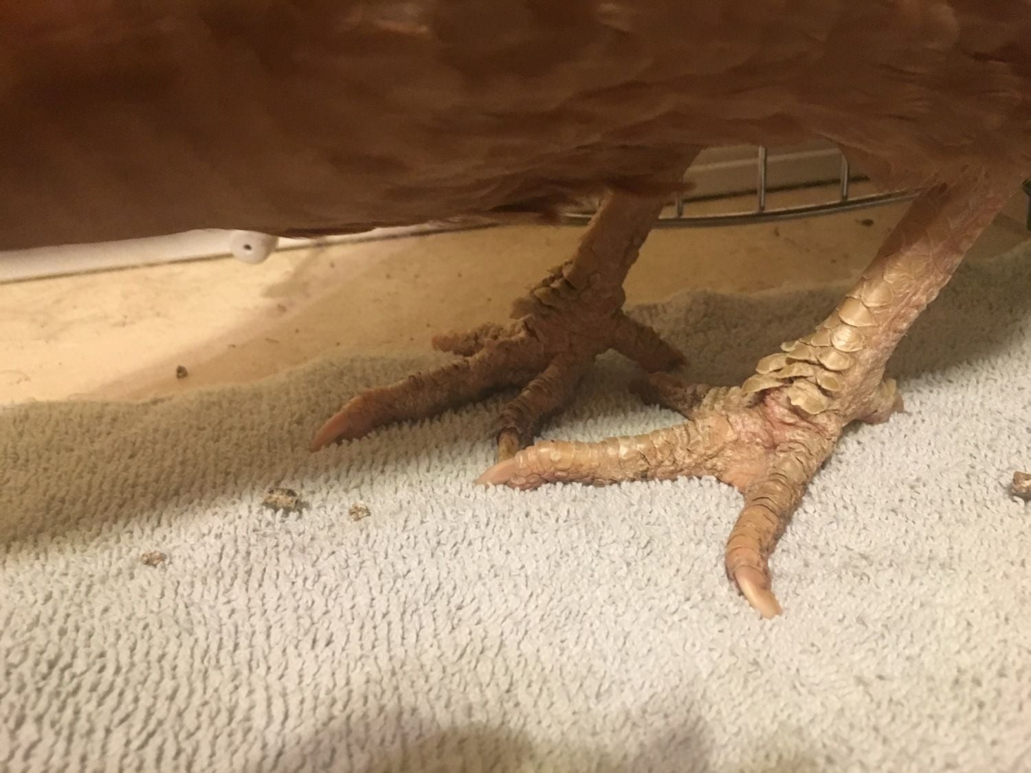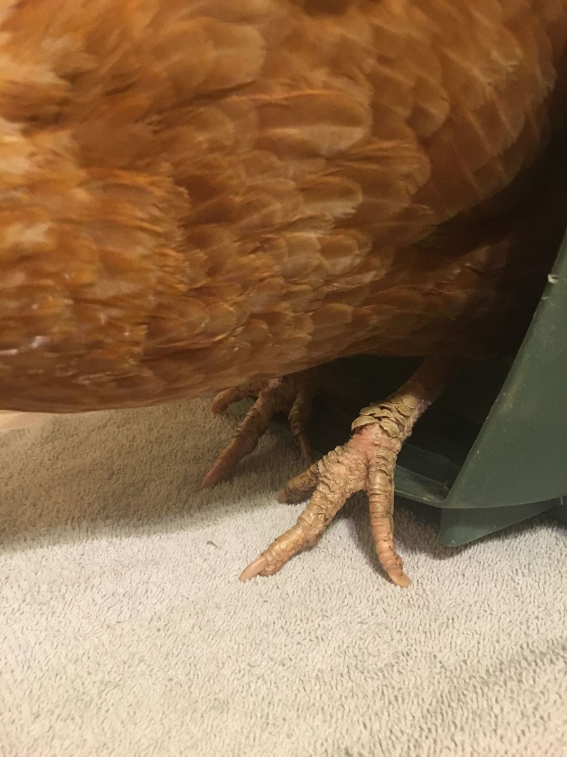 Golden is about 3 years old and is a blonde sexlink (at least, that's what my Aunt said). When I brought her home I set up quarantine and gave her a good exam. Unfortunately, her feet and legs are suffering from scaly leg mites. I took Golden to the local chicken vet for a wellness exam and they confirmed she has SLM as well as tapeworm.