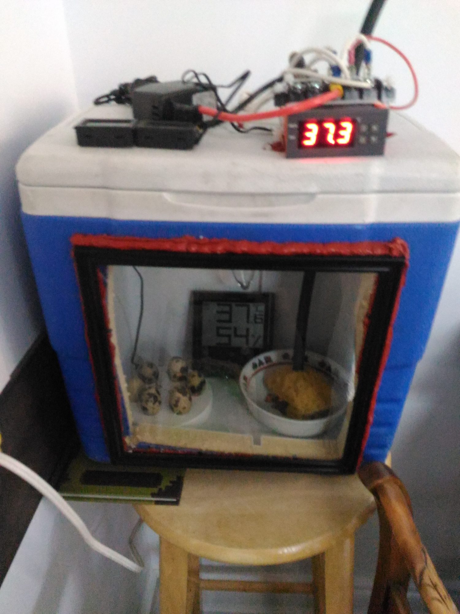 So I built an incubator for cortunix quail eggs outta a plastic storage bin old panel to a Guinea pig cage for a cover a heat lamp with a 75 watt bulb and a small jar of water for humidity the temp reaches almost 100 degrees f but every now and again will drop a few degrees to about 94 or 95 degrees but that's the lowest I've seen it go. How low a temp can quail eggs survive under before intervention is needed? And wat can I do to raise the temp and keep it stable? My quail eggs arrive this Saturday so I need answers before then thanks to all in advance!