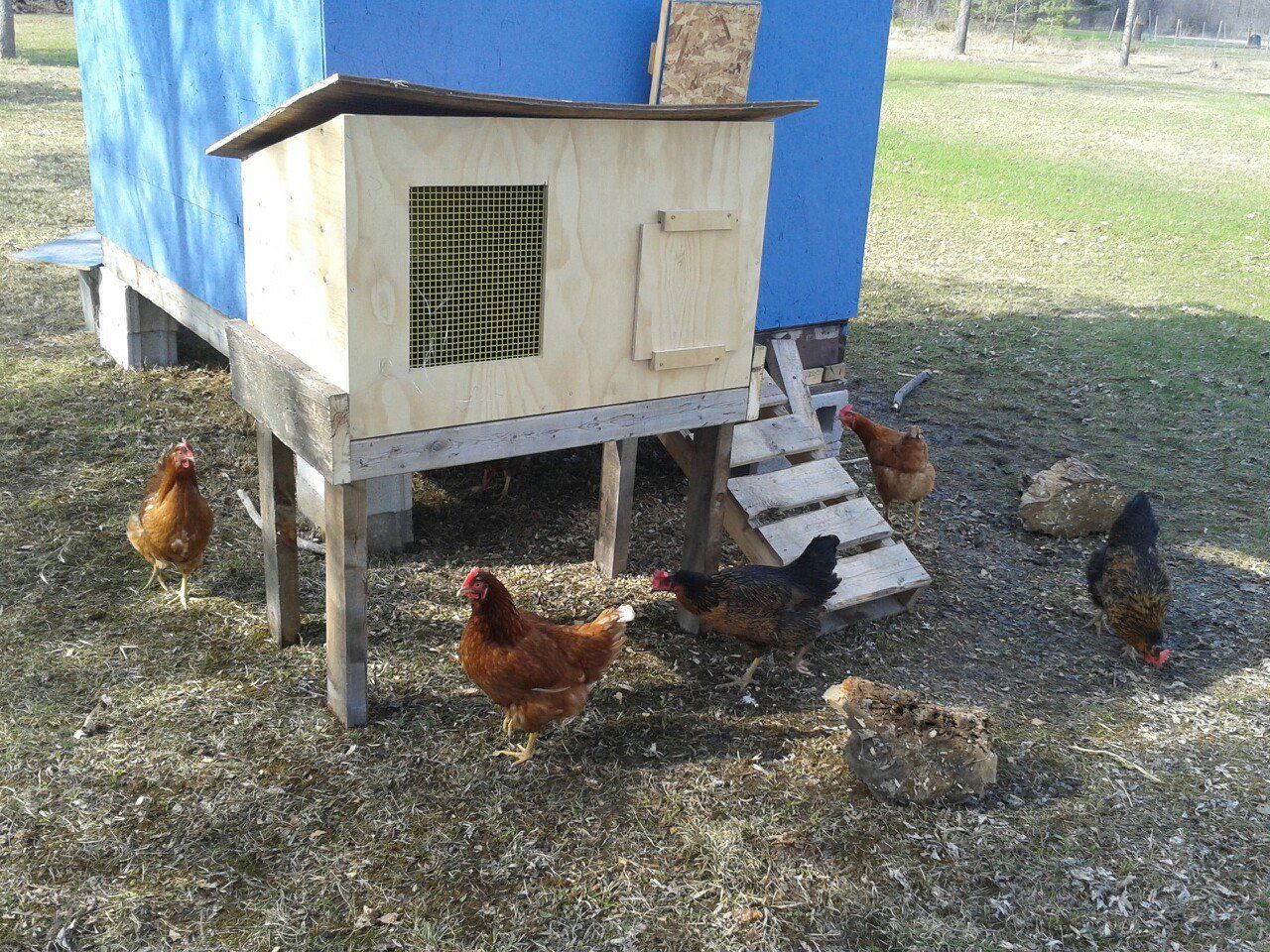 I made it on a pallet I had laying around and the total dimensions are 40" wide x 22" deep. There is one nest box inside and a short roost bar, but I've never seen any of them use it. They all huddle inside the nest box together, or alot of time the roo seems to hog it.