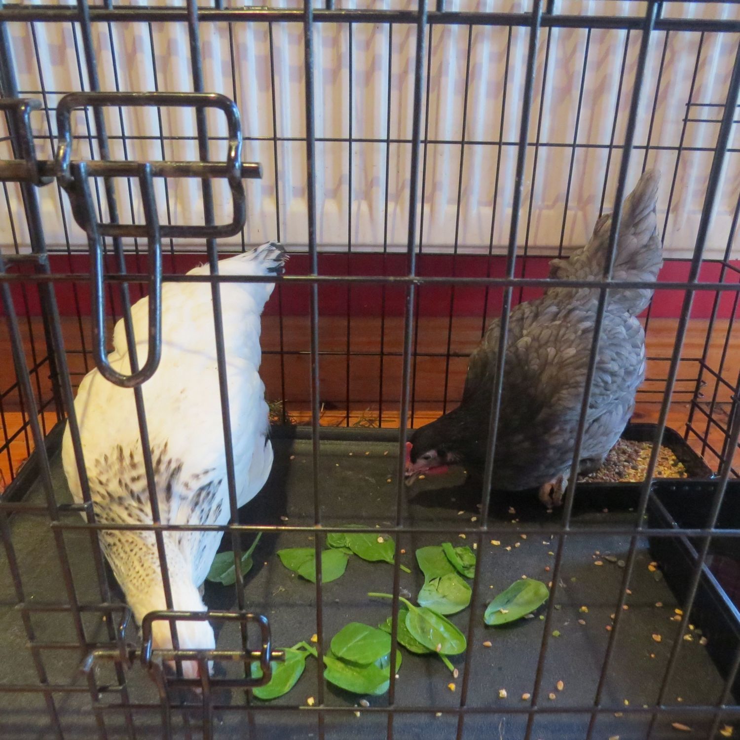 All I could find feed-wise was some mixed scratch and spinach for greens. Thank goodness I had the small cage at home for temp accommodation. Tomorrow we are going to empty the shed and start putting a run up for them.