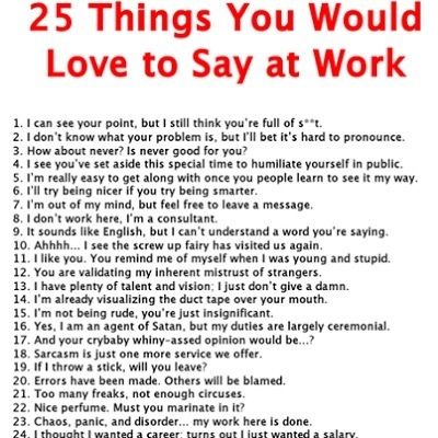 I'm not usually sarcastic, but my girls dad was/is and my youngest took after him for a long time. She has tried hard to stop but I can actually hear her saying/thinking these. And I must confess there are several that at one time or another ran through my mind.