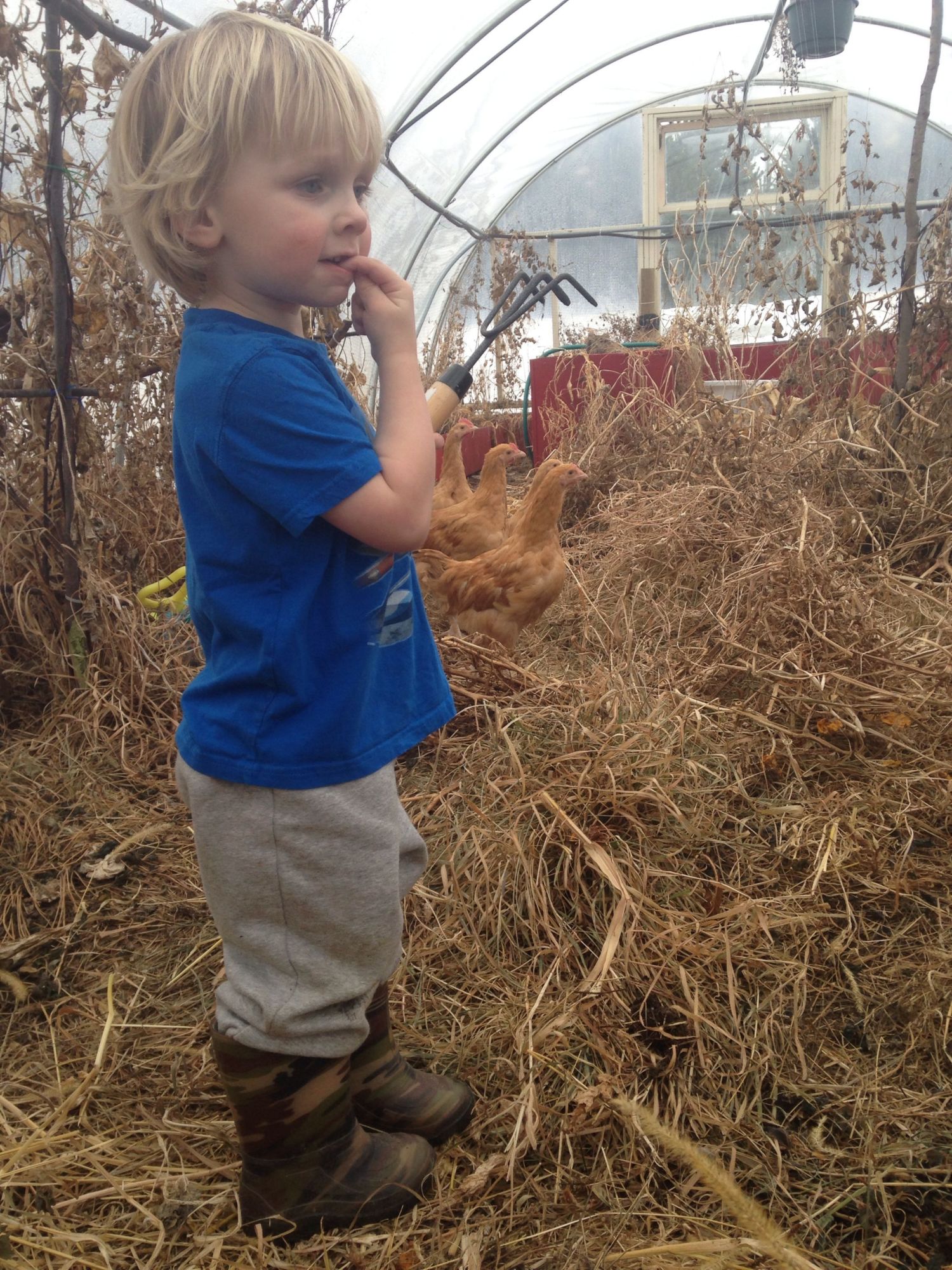 Working in the greenhouse with some young chickens in the background...