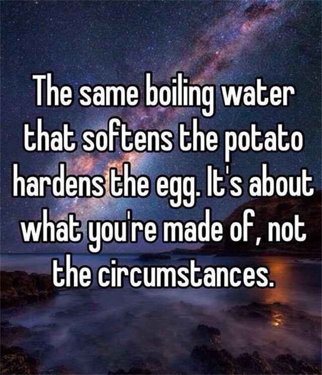 She did and noted that they were soft. He then asked her to take an egg and break it. After removing the shell she observed the hard-boiled egg. Finally he asked her to sip the coffee. Its rich aroma brought a smile to her face. “Father, what does this mean?” she asked. He then explained that the potatoes, eggs and coffee beans had each faced the same adversity- boiling water. However, each one reacted differently.