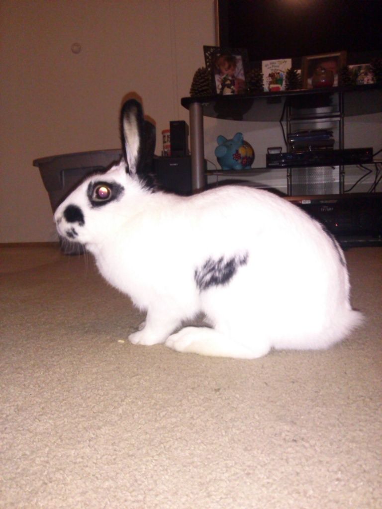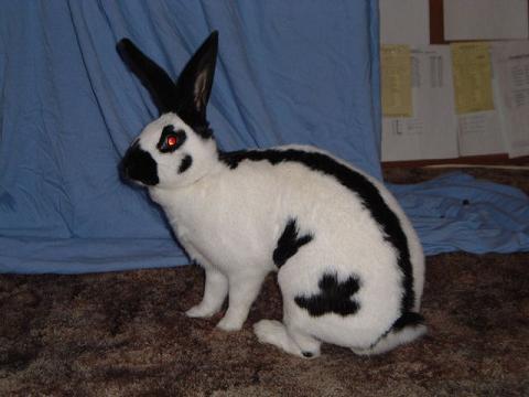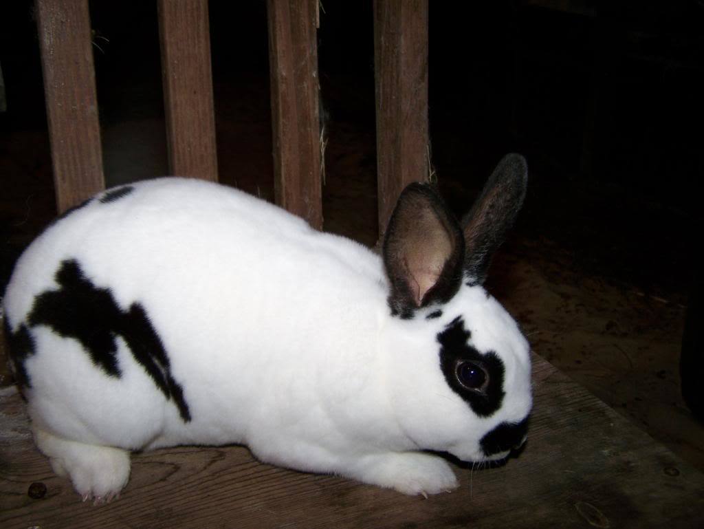 The rabbit in the picture below has similar markings, but it is NOT a Checkered Giant - it's a Mini Rex (adult weight, 4 lbs.)