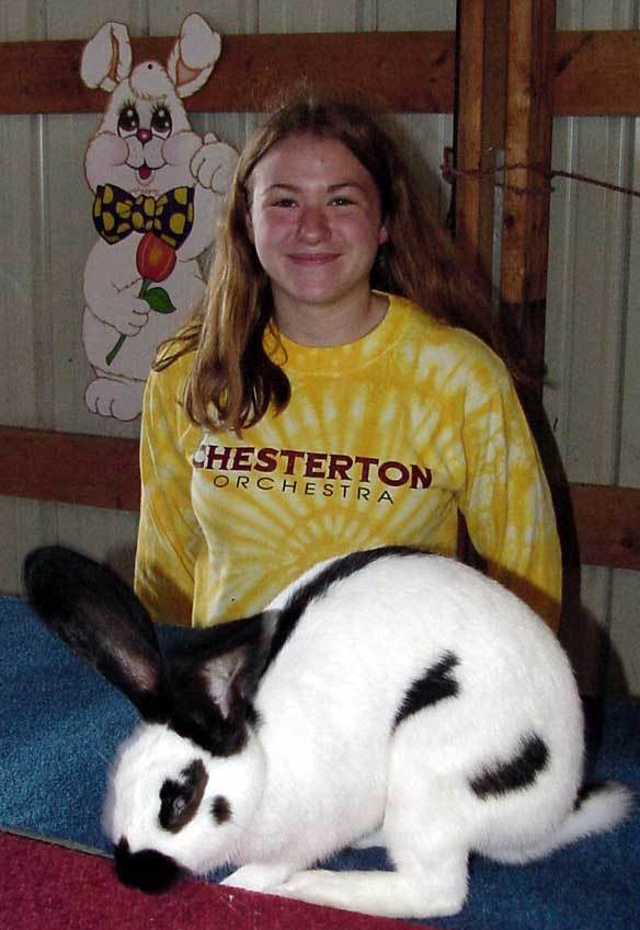 I agree that Bonnie's markings are somewhat similar, but the important word with this breed is "Giant." They may weigh as little as 11 lbs at maturity (roughly the same weight as a New Zealand) but they are slender animals, so they have a whole lotta frame for the weight. The rabbit in the picture below is a little closer to the camera than its owner is, so it looks a bit bigger than it really is, but you get the idea ;