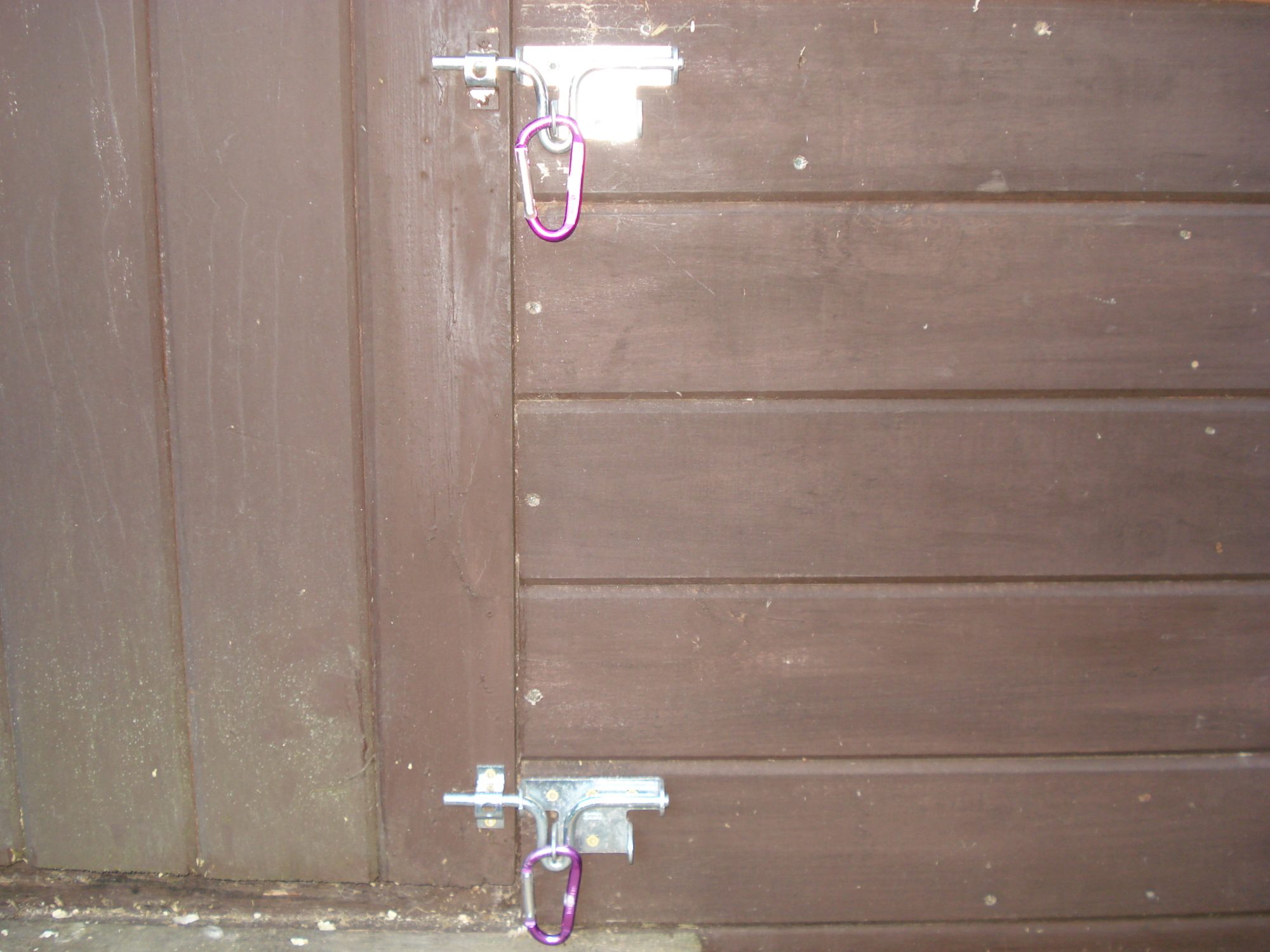 Hardware cloth over all the windows, strong metal vents with many screws, gate latches with some kind of lock and a big sign that warns the raccoons