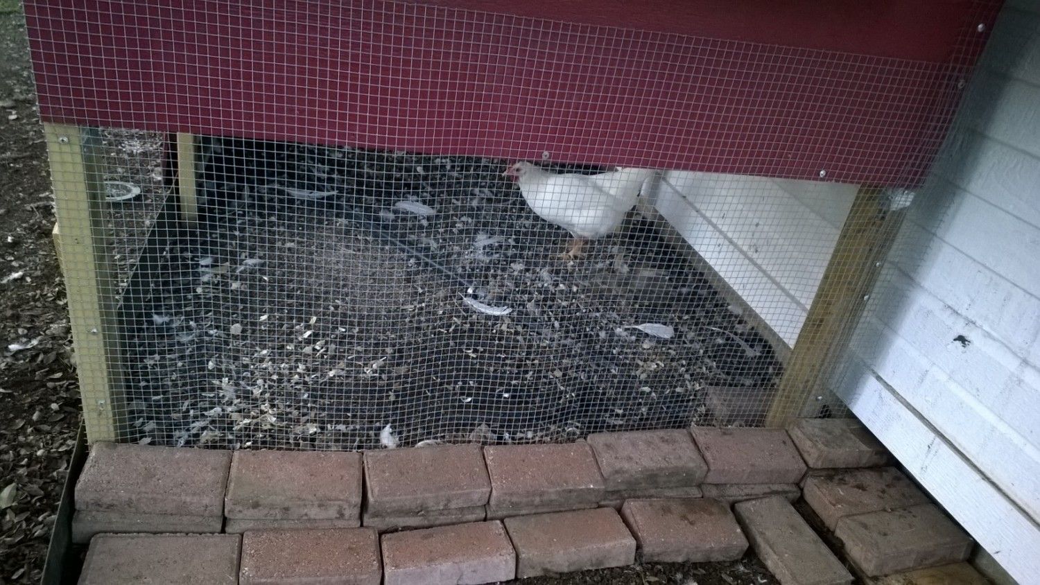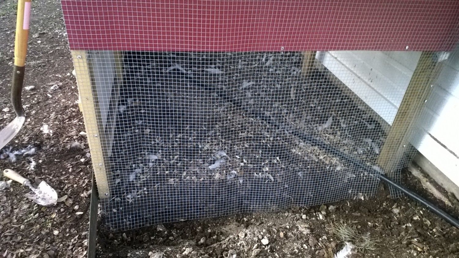 Cover the chicken wire with hardware mesh screwed into a wood frame. Use wire mesh around the edges on the ground to prevent digging. You can hammer pins used to secure landscape fabric. Your plastic bins may not be secure. Raccoons can reach into a 1" opening and still kill your chickens.