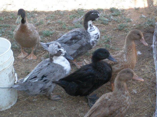 Updating with a picture of my six ducks. Three Blue Swedish and three Khaki Campbells. You can see that they are loosing the last of their duckling feathers and dressing up in their adult finest. The male Khaki is upper left and is pretty obvious. He is going to have a great dark brown/black greenish head and neck by the time he if finished. The Swedish I am not so sure of. I thought the black one was the male but the grey and white with no top knot is now the largest and is beginning to take on the habits of leading the others around. Yesterday I was putting everyone away for the night and almost stepped on a rattle snake in the ducks run. Must have come in for water. I managed to get the ducks out of the pen and, as you can see, using a shot gun divided the snakes head from its body.