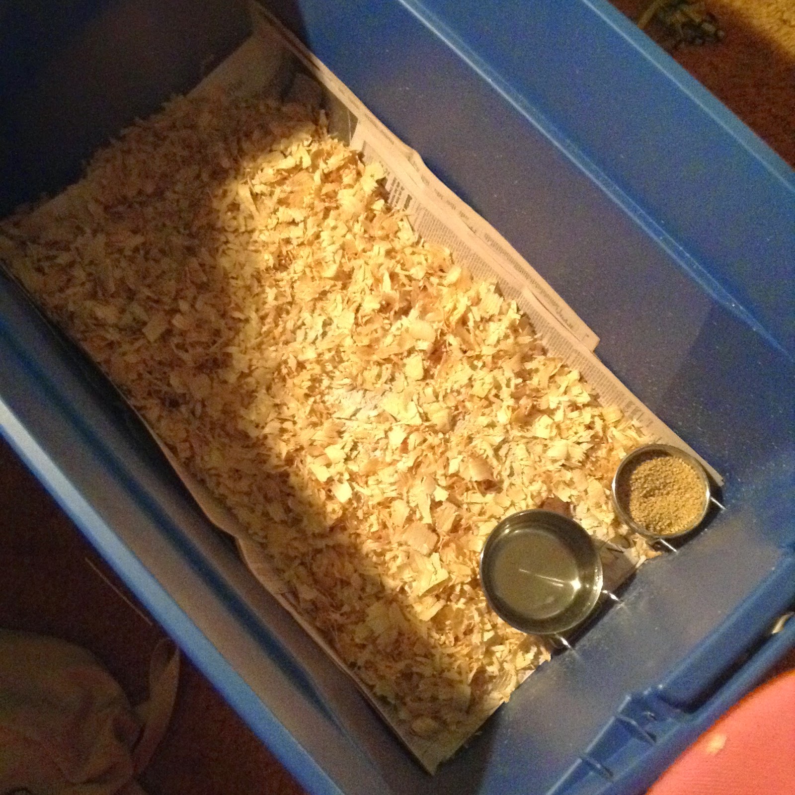 When you first get your ducklings you may want to start out with little wood chips on the floor as the ducklings may think they are food. If you still think you want to use wood chips get the bigger flakes. For the bottom of the brooder you can layer up paper towels or newspaper to absorb water spills. And trust me, ducks are one of the messiest creatures!! They play in their water dishes and try to swim in them. This is why it is important to make sure their water dishes are NOT DEEP, as they can drowned. When a ducklings fluffy down gets soaked, the weight of the water in their down can make them sink. I like to have my ducklings water and feed dishes hang on the side of the brooder so that they can not dump their water and make a bigger mess!!Make sure the ducklings have access to water all the time, as they can choke on their food without it. I feed my ducklings crumble chick starter, but make sure it is not medicated feed, as ducklings can overdose on the medications. Adding Brewer's yeast to the feed helps grow strong bones and legs, as it contains niacin and other amino acids essential to a healthy life