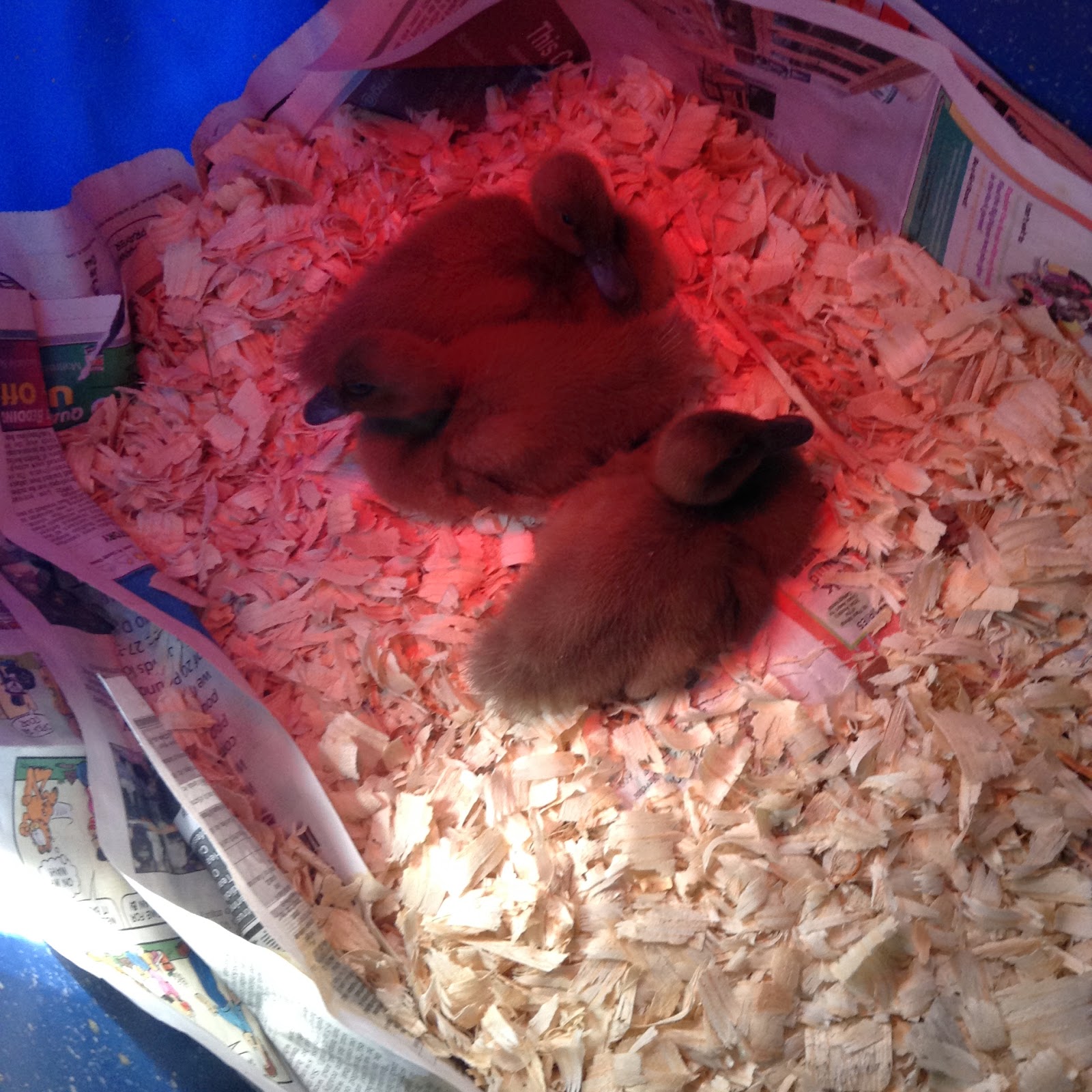 As you place each of your ducklings into the brooder dip their bills into the water dish to show them were it is. I add about more than a pinch of sugar to their water for an extra boost of energy. You should check each duckling for pasty butt, a condition when poop dries on the vent of a duckling, making it so that a duck can not poop. This is a emergency case that mostly occurs in mail ordered ducklings but can happen to any duck. If you have a case of it, gently wash the vent with warm water. Check each day for signs of it again, but it should clear up in a few days. Make sure your new ducklings are comfortable in their new home and watch for signs that they are too cold or hot. Cold ducklings will be clustered under the heat lamp quaking unhappily while hot ducklings are as far away from the heat lamp as they can get and will sometimes start panting. Happy ducklings will run around the brooder excitedly. It is normal for new ducklings to sleep a lot as they are babies.
