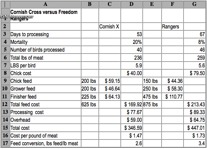 This comes from the blog "backyardfarming" and I find it to be a pretty accurate assessment of over all costs, feed conversion ratios and per lb costs. Cornish cross should require around 2.5lbs of feed to put on 1lb of growth. A freedom ranger (or similar "slow growth" hybrid) will require 3.5lbs of feed for 1lb of growth. That adds up fast, and for most people it's already more expensive to raise their own chickens than to buy meat from a grocery store. $1.50/lb is about what I pay for a whole chicken I buy and I didn't have to put any work into it. So adding more expense and more work (harder to pluck, even longer grow out time) is very counter productive for me.