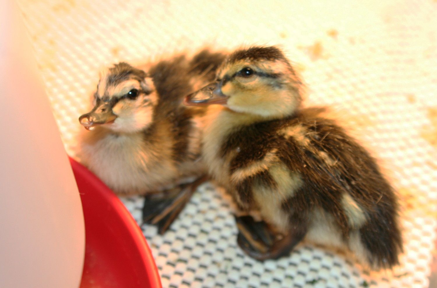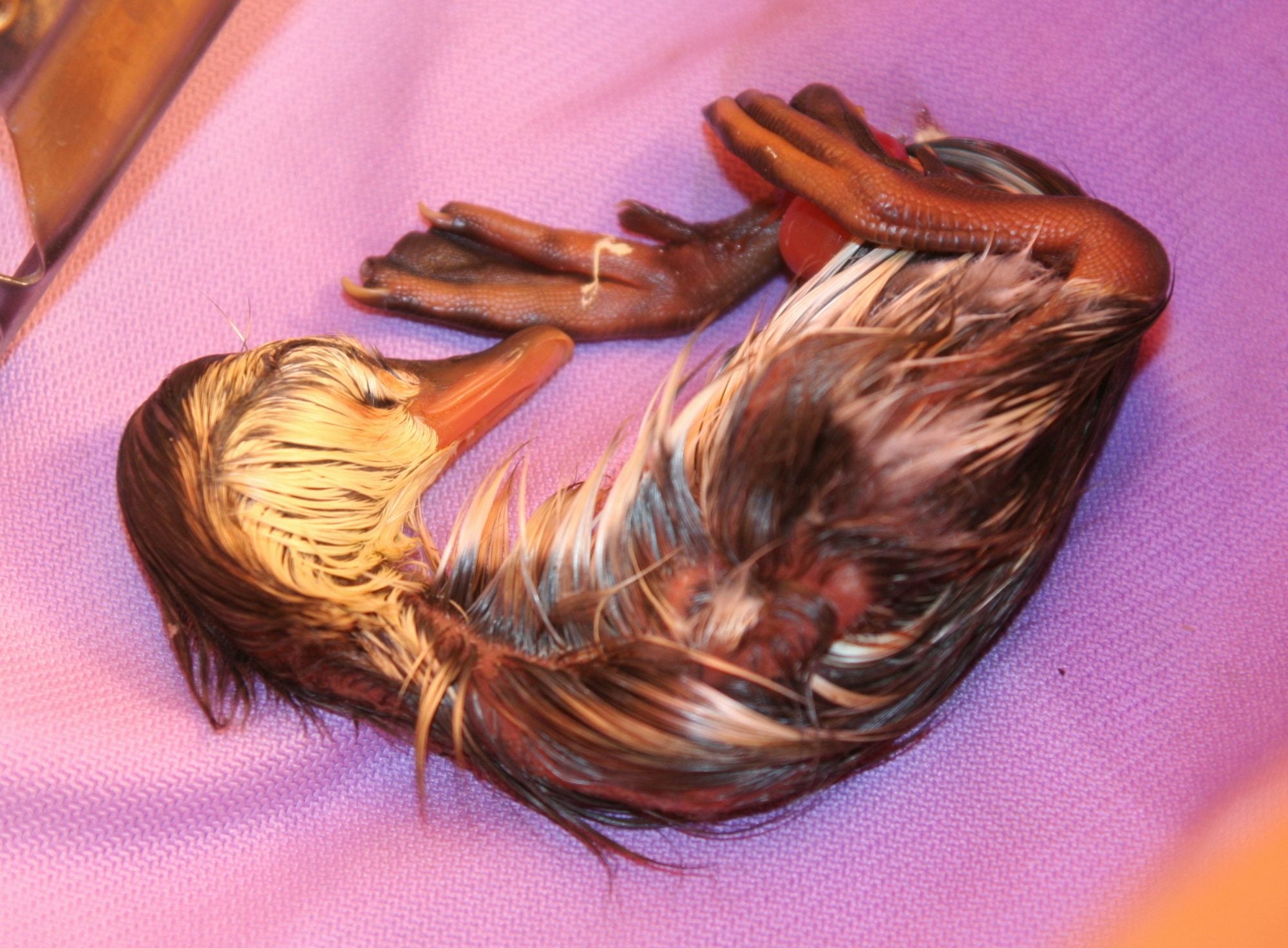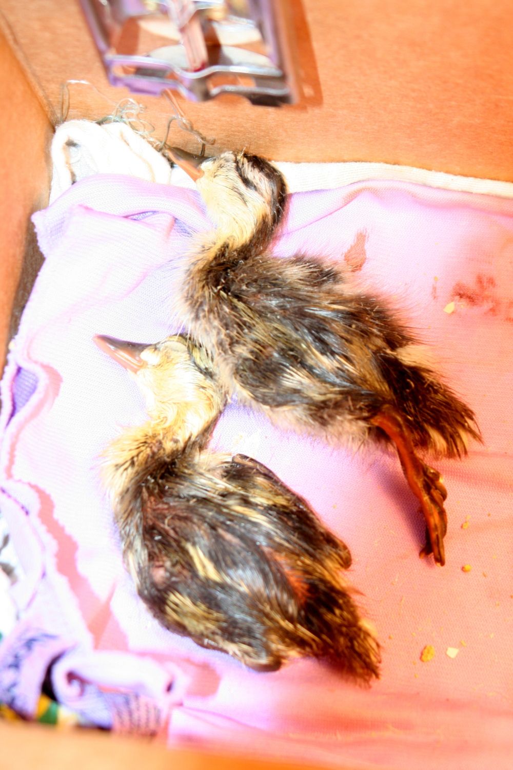 Thanks for the reply's. We made an incubator from a cardboard box with a towel on the bottom and a clamp light that's not directed right at the eggs to minimize direct radiant heat and a towel covering. The temp is a constant 100. One of the chicks passed last night, it was very exposed and received a lot of damage in the fall. The second one that's exposed from the fall is still breathing and peeping (once in a while) and wiggling a little bit. The membrane that was exposed is pretty much off (I called a hatchery that has ducks, but not wood ducks, and she said to use a moist paper towel (warm) and gently help the membrane so they don't get stuck. I tried this very carefully just to the edge of the shell. No bleeding except from the initial fall/crack and that was a teeny bit and it's stopped. He/she seems to be resting tonight (do the "sleep" at night?), not as much movement, but still sticks out it's tongue and wiggles a bit. Breathing regular. Should I try to get it the rest of the way out of the shell (it's almost halfway out, still curled up but trying to move it's feet) or should I just let it be and see what happens at this point? I don't want to handle it to death, but I don't want to neglect it to death either. The intact egg has a small round area where it's slightly cracked and pushed out as if it's starting to hatch. That hasn't changed since yesterday. It wiggled a bit last night and I could feel it moving when I first picked it up...little ticks. I still feel a little movement, but it's also quieter over night. I've not heard any peeps. I put a damp paper towel in the box to keep the humidity up a bit...I'll switch to a clean sponge. The head that's peeking out has stripes over the eyes. Could they be something other than wood ducks so high up in a tree? Thanks again for any and all advice and information!