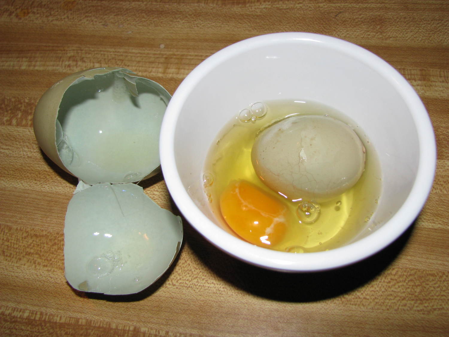 Just saw this post and had to add mine! One of my young OE's gave me the largest chicken egg I've ever seen! What was inside? A regular yolk and white, and... another whole egg! She is a Birchen Marans x Easter Egger. No. This is not her usual egg! Anyone else seen this before?