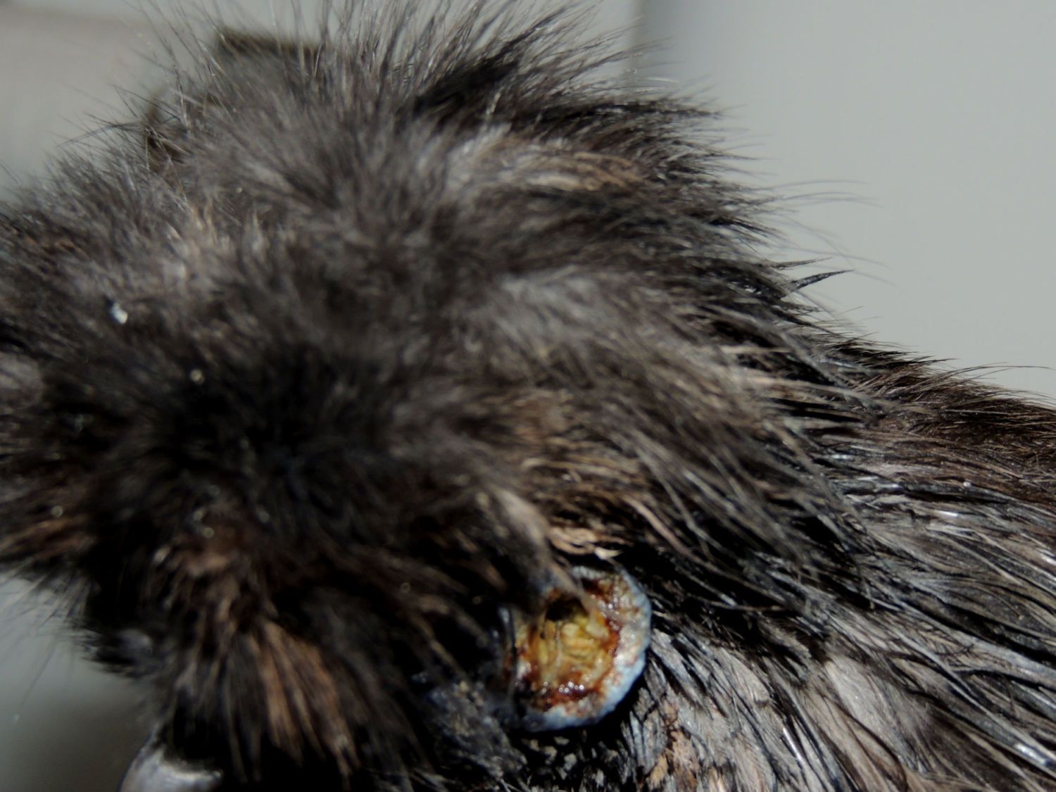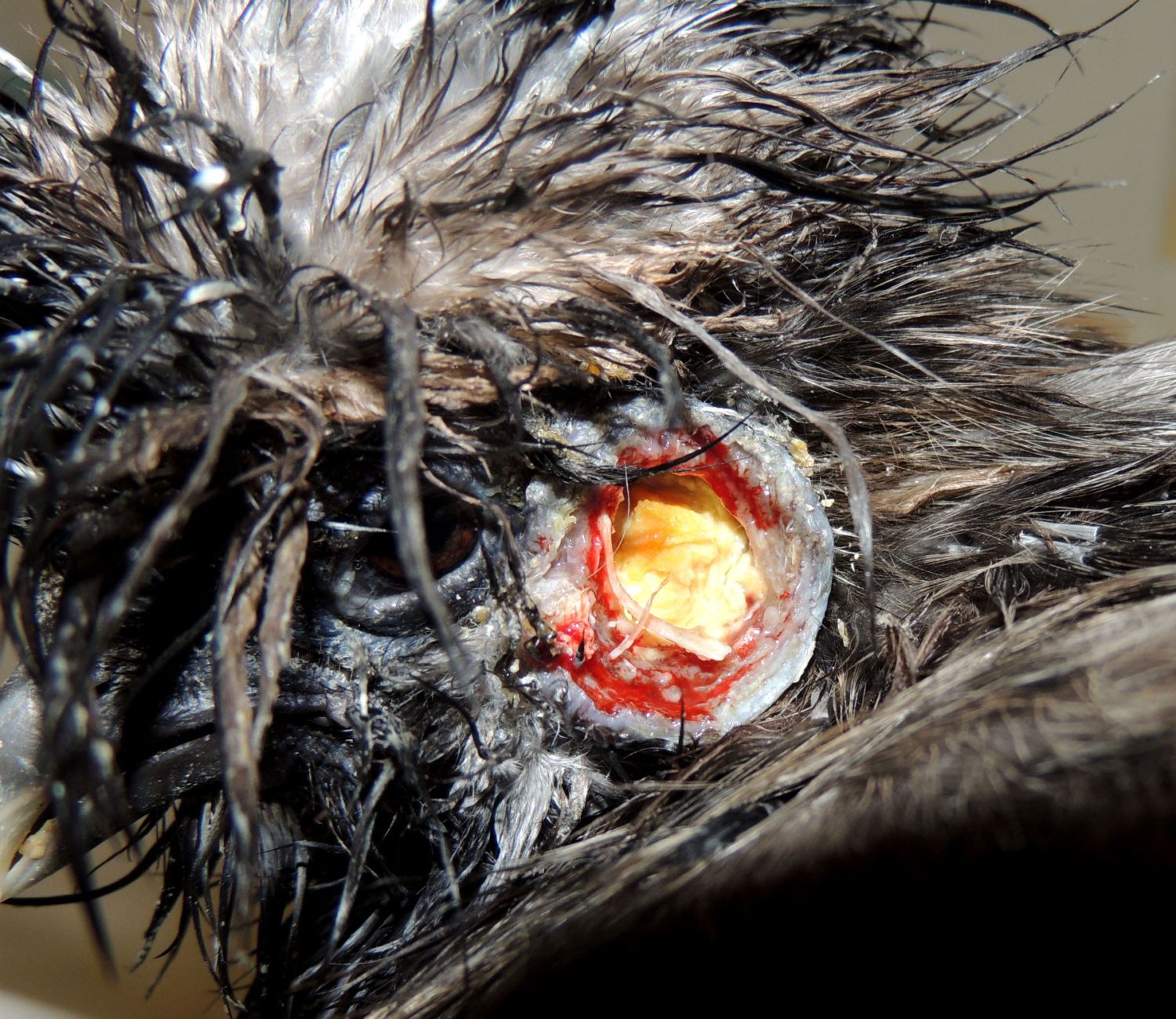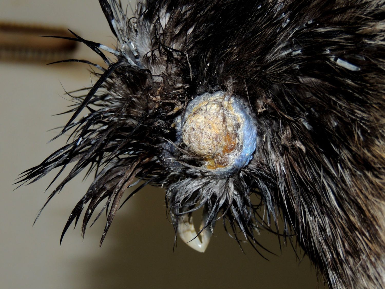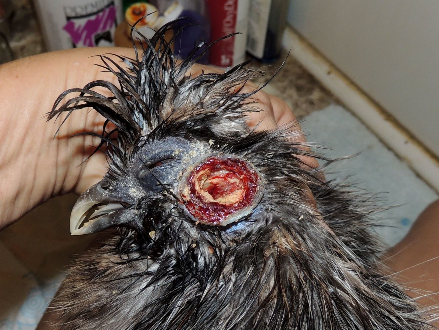 I clean it out every night with a warm peroxide/water solution, then pack the hole with neosporin. I put 100mg of Amoxicilling in her drinking water, along with vitamins. She is perking up well. This is what it looks like now