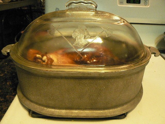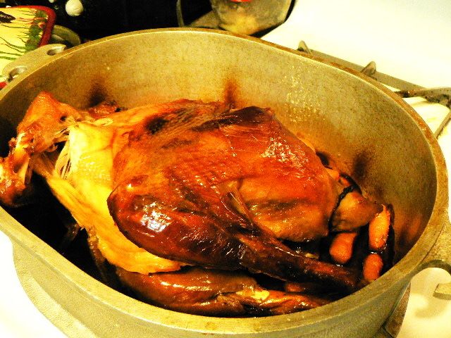 I usually sprinkle on some herbs/poultry seasoning, but don't salt until after cooking. If I'm using the enamel roaster I add water in the bottom because that lid isn't as tight, then put turkey on a rack. I don't stuff birds, but wait and make the stuffing flavored with juices from the bottom of the pan. To finish cooking a bird, I take the lid off, rub the skin all over with a stick of butter, and raise the oven temp to 300-350 F and keep an eye on it until it's browned. Then remove, LET IT REST for at least 20 minutes before cutting. As with a beef roast, this step is important to keep from losing the meat juices when you carve the bird.