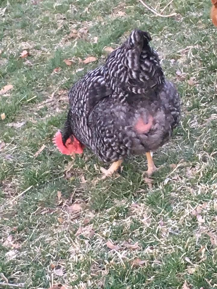 Our almost year-old Barred Rock hen has this featherless area under her vent. She is acting perfectly normal, running around and foraging, and we got an egg from her just this evening. Attached is a photo of her backside with the featherless area. Is this bacteria or something? Any help appreciated.