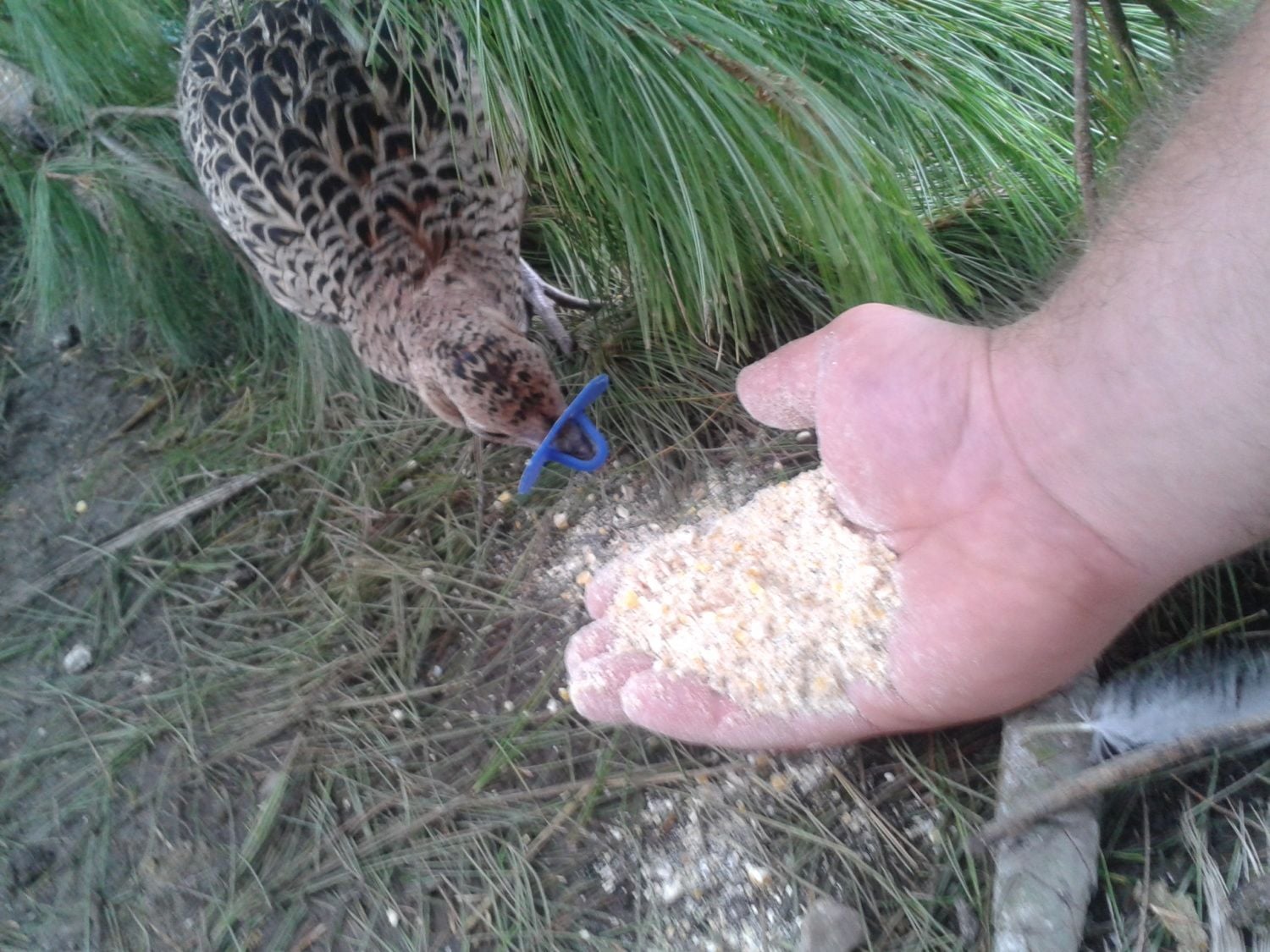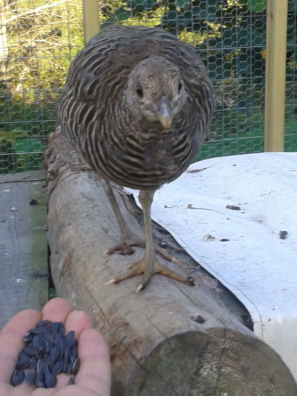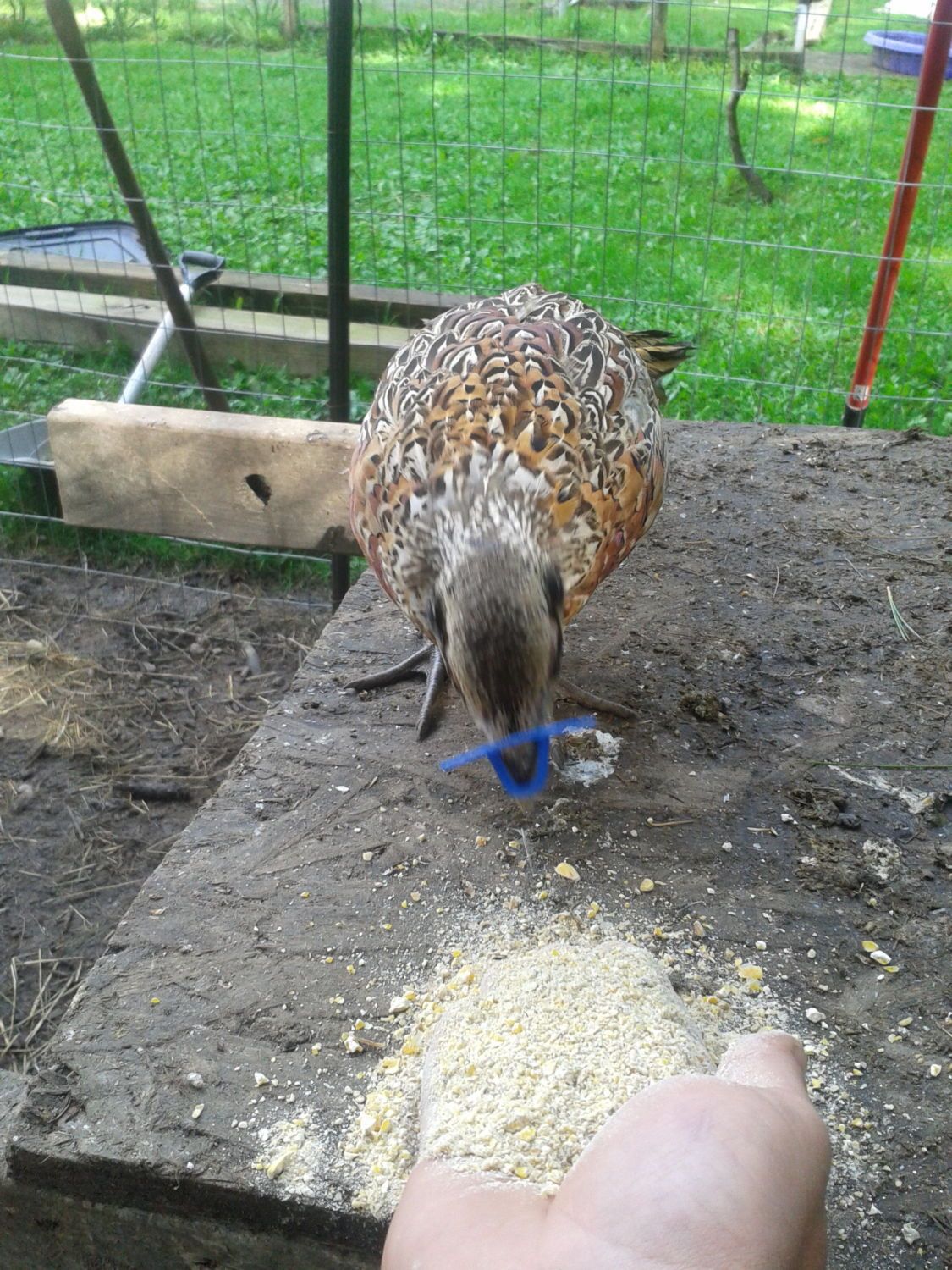 so i was filling the spots for food in the pen and throwing out sunflower seed and then one jump on my shoulder...i didnt know which bird it was so i picked my phone out for a quick pic and it was one of my small silver golden/ maybe golden...the guy i bought the seven from was unsure if i got some of his silver goldens...but here it is and then i fed it from my hand as well...they have only been in the pen for about three weeks...so you can tame them very fast...i spend atleast two maybe three hours a day in their coop and pen...