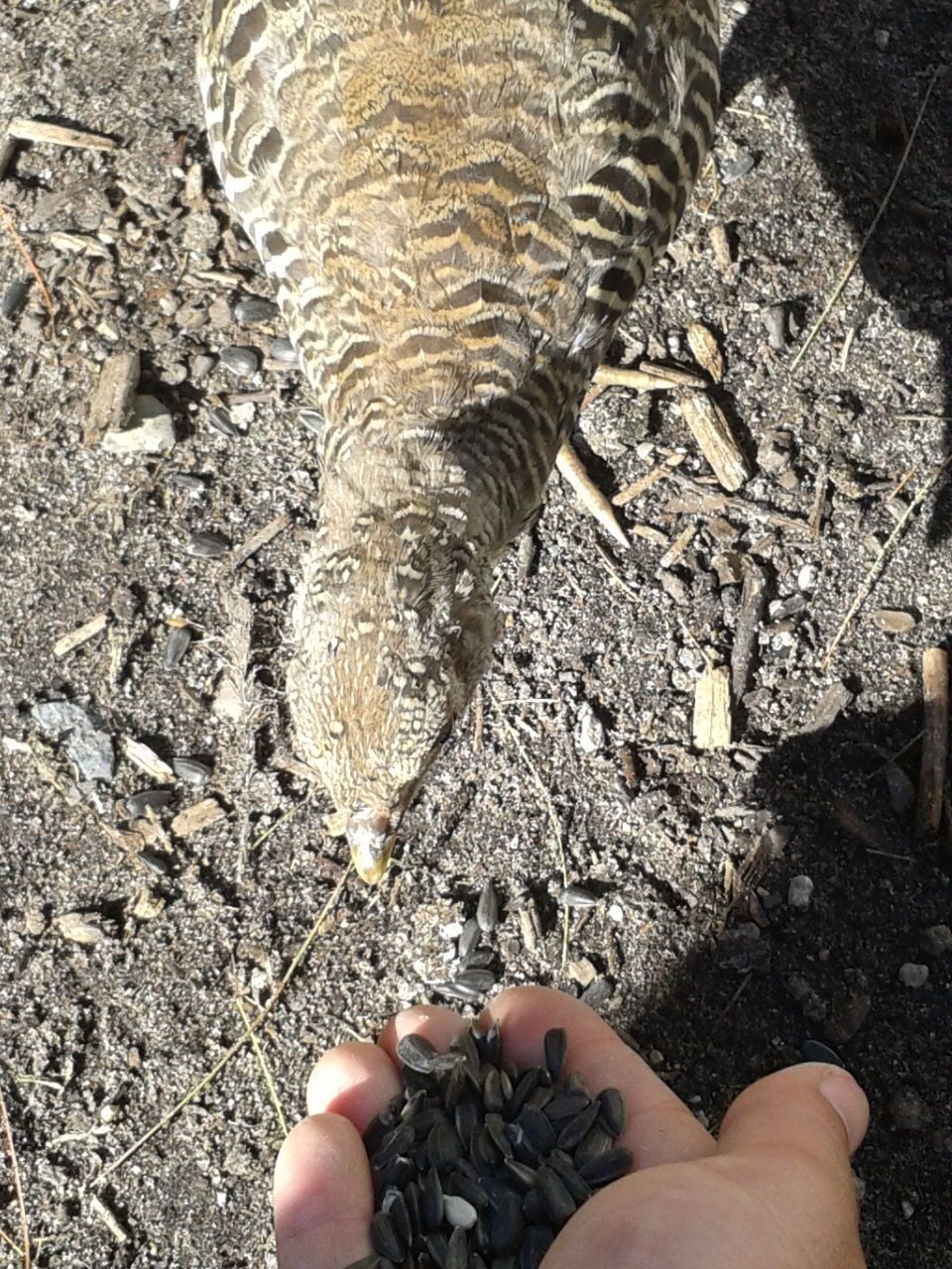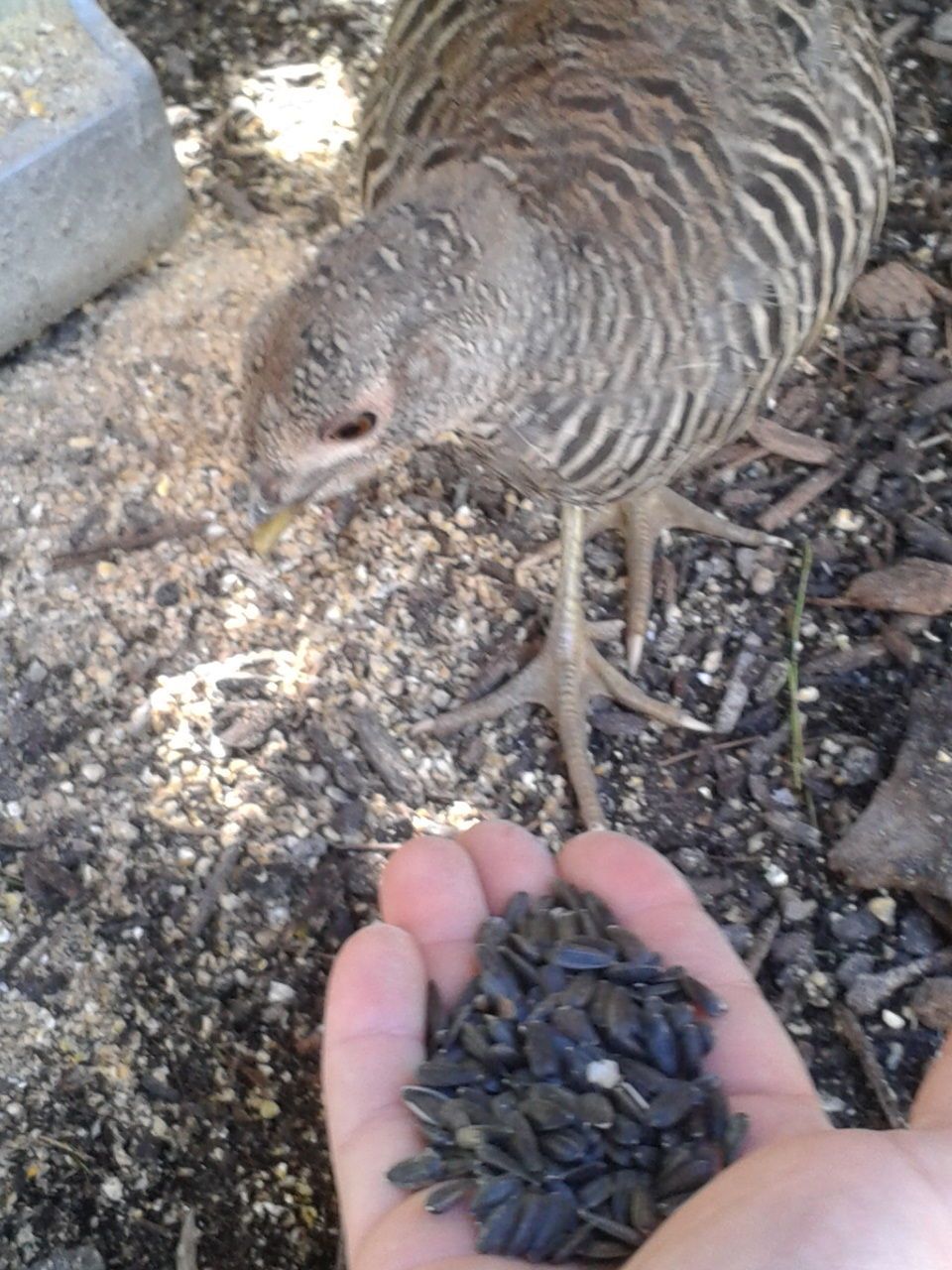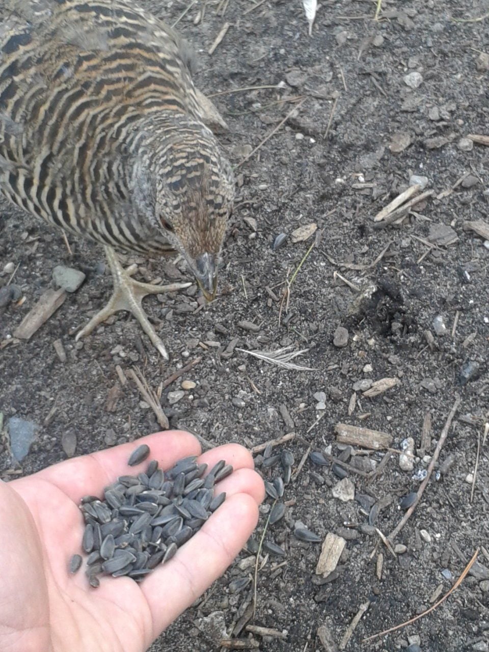 so i was filling the spots for food in the pen and throwing out sunflower seed and then one jump on my shoulder...i didnt know which bird it was so i picked my phone out for a quick pic and it was one of my small silver golden/ maybe golden...the guy i bought the seven from was unsure if i got some of his silver goldens...but here it is and then i fed it from my hand as well...they have only been in the pen for about three weeks...so you can tame them very fast...i spend atleast two maybe three hours a day in their coop and pen...