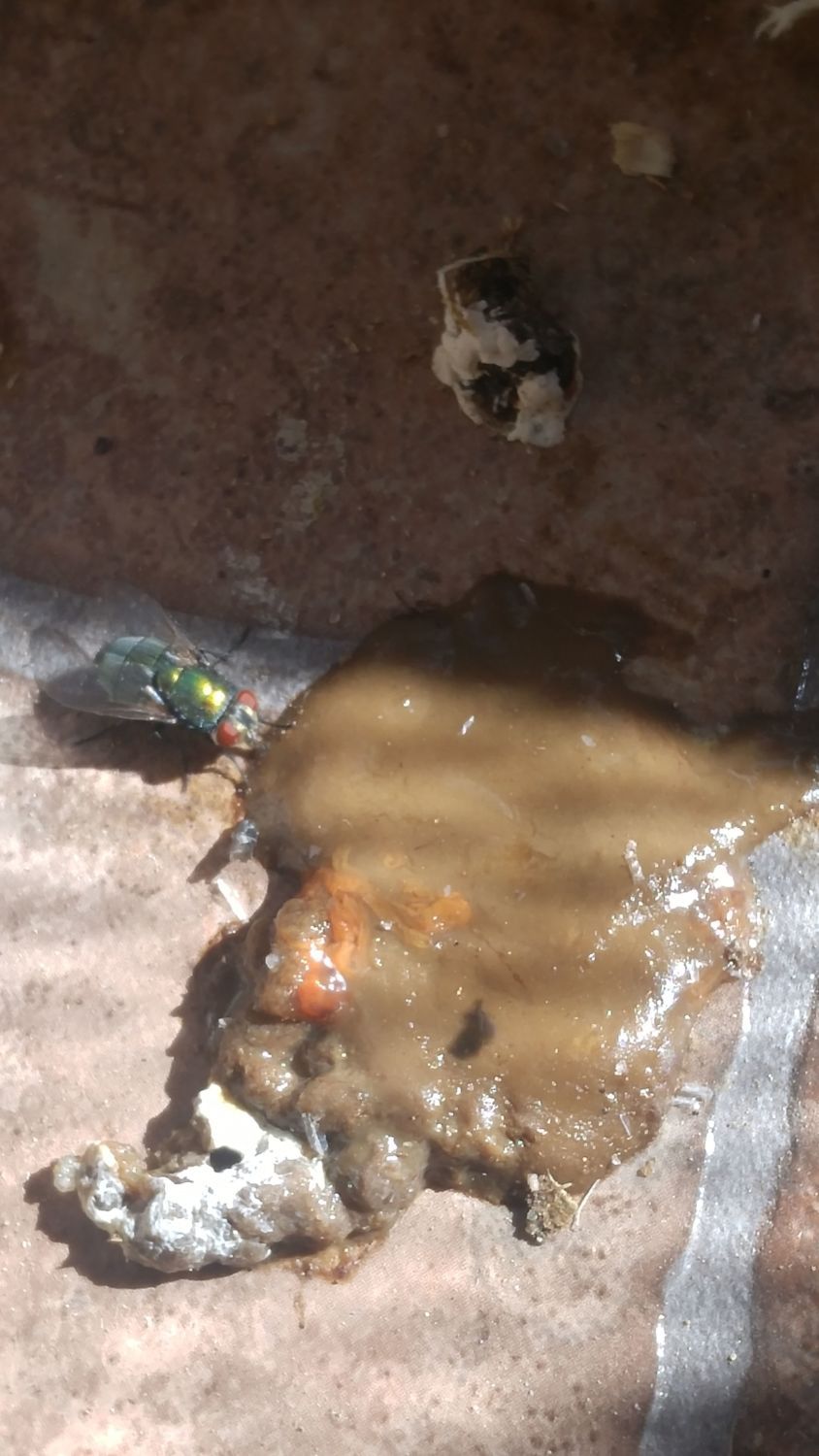 Yesterday morning I woke up to little bits of red (looked like intestinal slough off) in my girls feces and they had JUST decided that they DO in fact like strawberries (FINALLY) the day before. It's been particularly hot so I gave them as many chopped up frozen strawberries as they'd eat (only about 3 total). They had some runny poo that I attributed to the heat as they were too hot (I have since made mods on their coop so this is not an issue any more.). Yesterday they ate frozen strawberries again (more yesterday) and this morning I went to feed and clean and I saw these on the poop board...