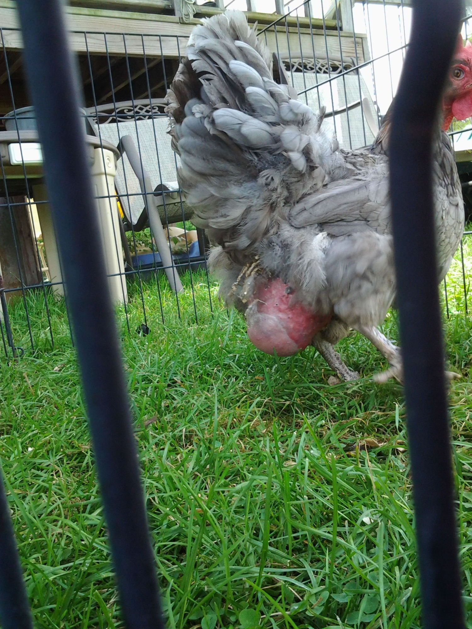 Some antipick lotions, or a bad tasting ointment such as Nustock or Bag Balm from the feedstore may keep anyone from pecking her. BluKote can cover up the redness to reduce pecking, but the eggs will be stained with blue. When feathers start to regrow, they will be very attractive if there is a picker. If her abdomen is painful from a possible reproductive issue, she could be picking her own feathers. Pictures of chickens with peritonitis and ascites, or tumors show reddened featherless bottoms. Here is a good article by Sumi about egg quality problems: https://www.backyardchickens.com/a/common-egg-quality-problemsI haven't seen any of the others peck at her. The roosters don't even go after her like a few of the other hens, so she's not missing any feathers on her head or wings. Before June I thought maybe she was roosting in a nesting box instead of on a bar. But when my younger 9 got old enough to put in with the older ones, they would roost on the bars in front of the nesting boxes at night. I think because they were higher up & felt safer. Since then I see her roosting on the bars with the others.