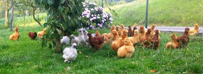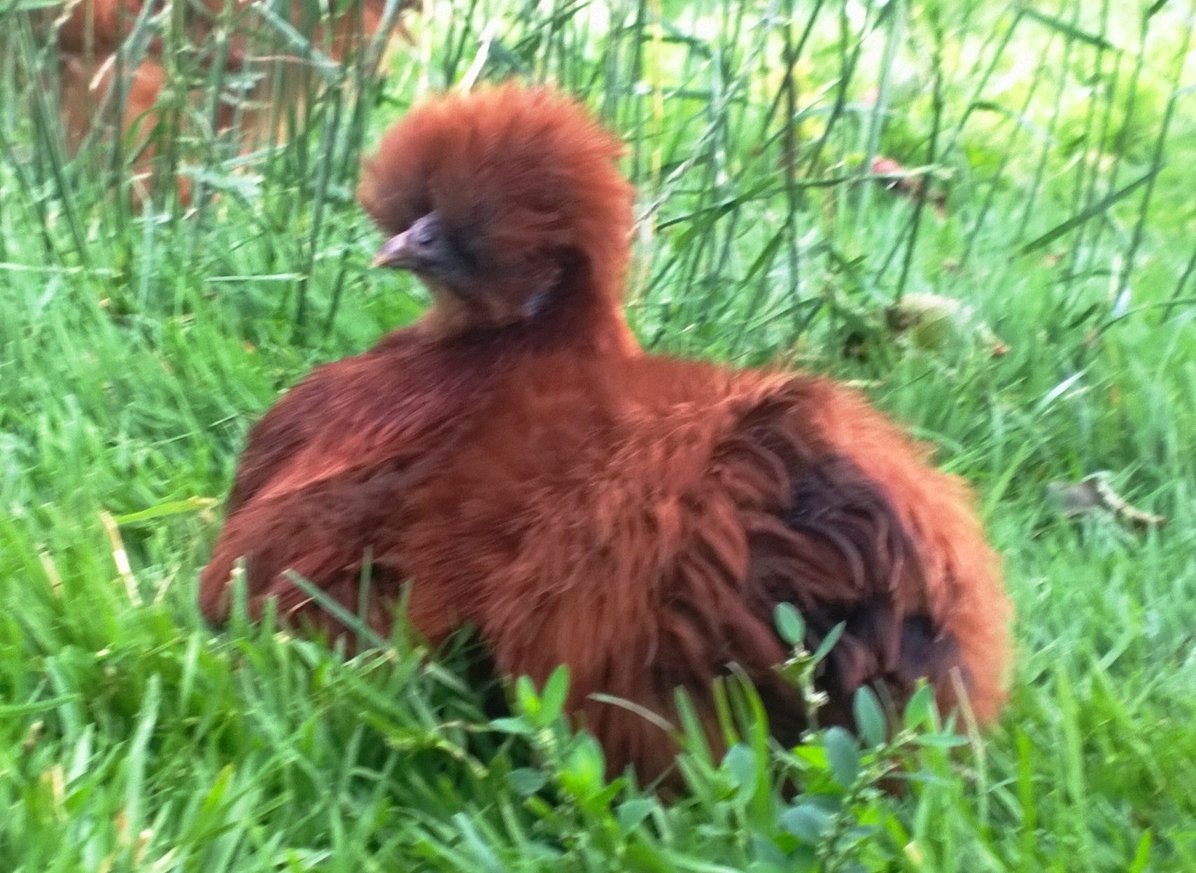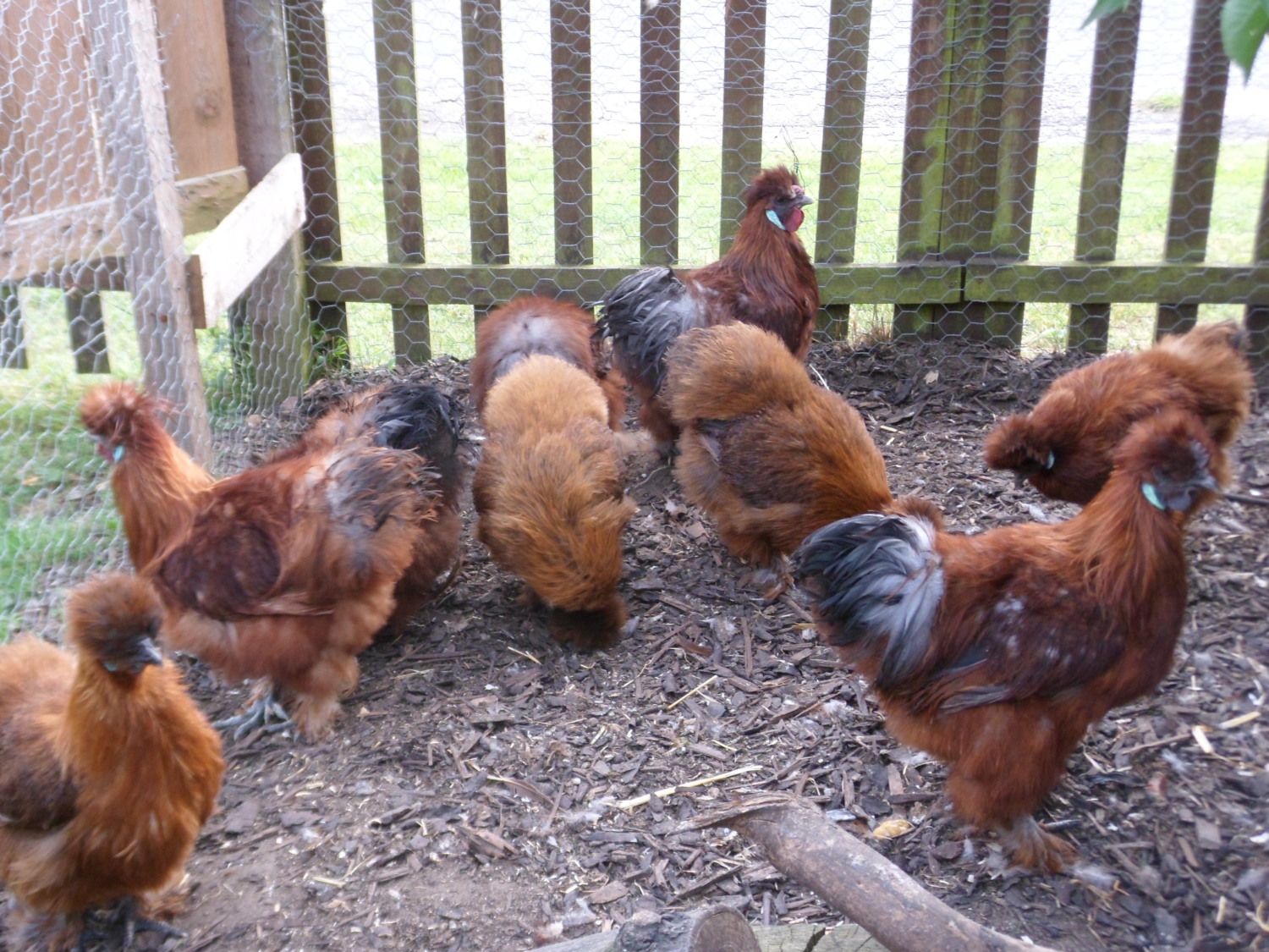 theese are my babies. 5 boys 3 girls and mumma. this was taken a few weeks ago, there 26 weeks now and the litlle girls have started laying this week. I brought them from an auction as tiny chicks with there mum as pure red silkies