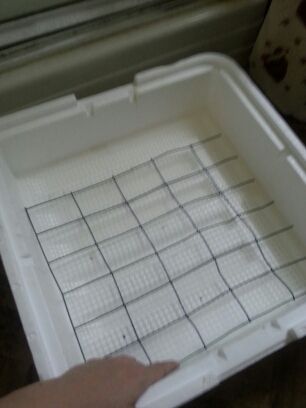 I measured how far the eggs would have to roll to make a complete 180° turn. I subtracted that from the width of the incubator, and cut 2" x 4" coated wire (left over from chicken-proofing the garden) in that size. Due to the size of the incubator, I had to cut the ends of some of the squares, but the wire is still strong enough to turn the eggs. I can now fit up to 30 eggs (one in each square) and can turn them in 3 seconds flat by either pushing or pulling the wire across the incubator floor.