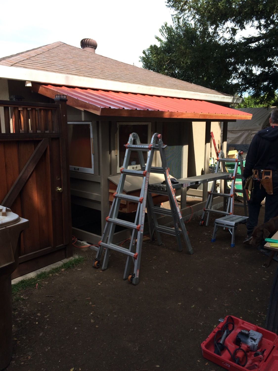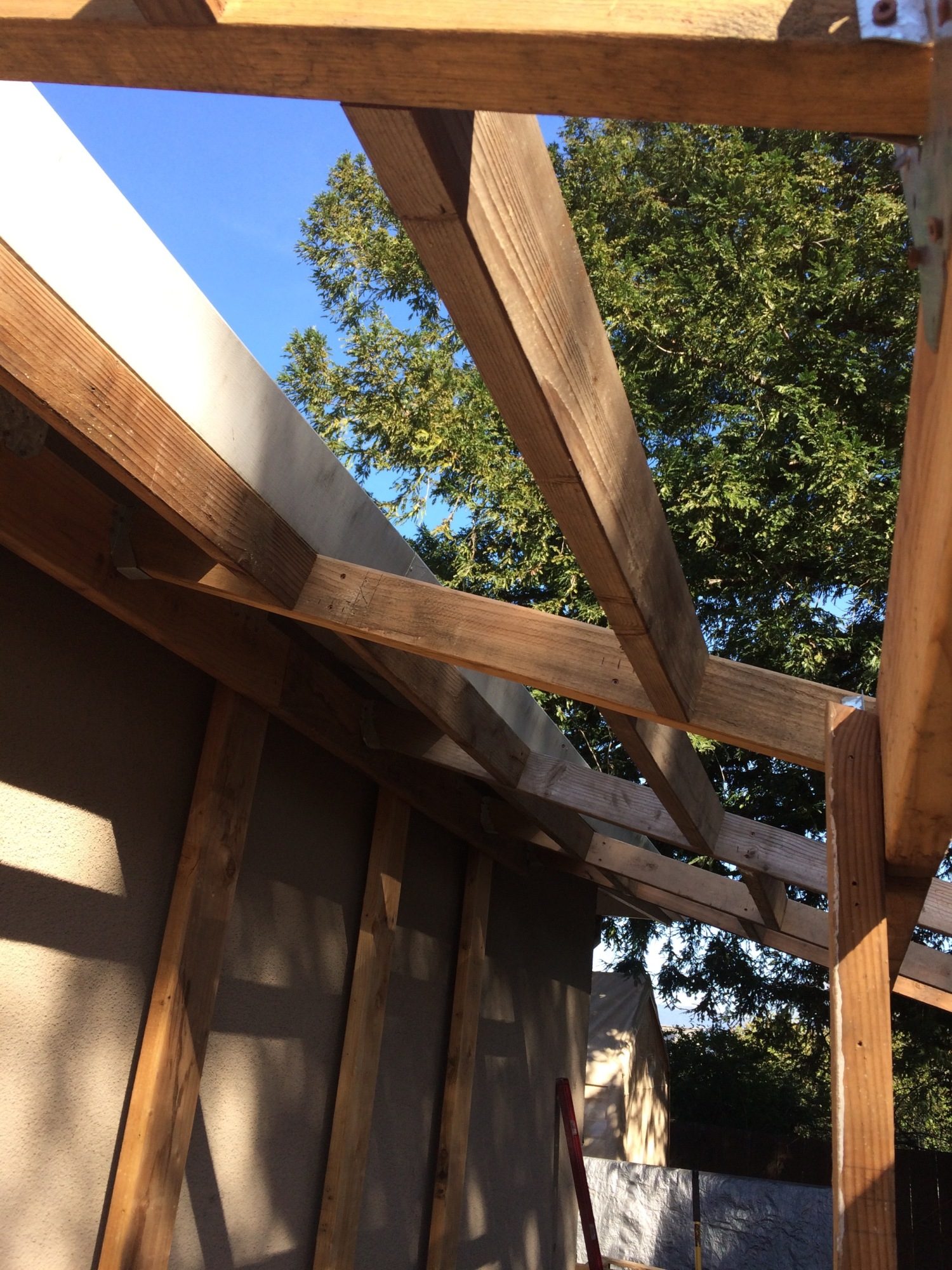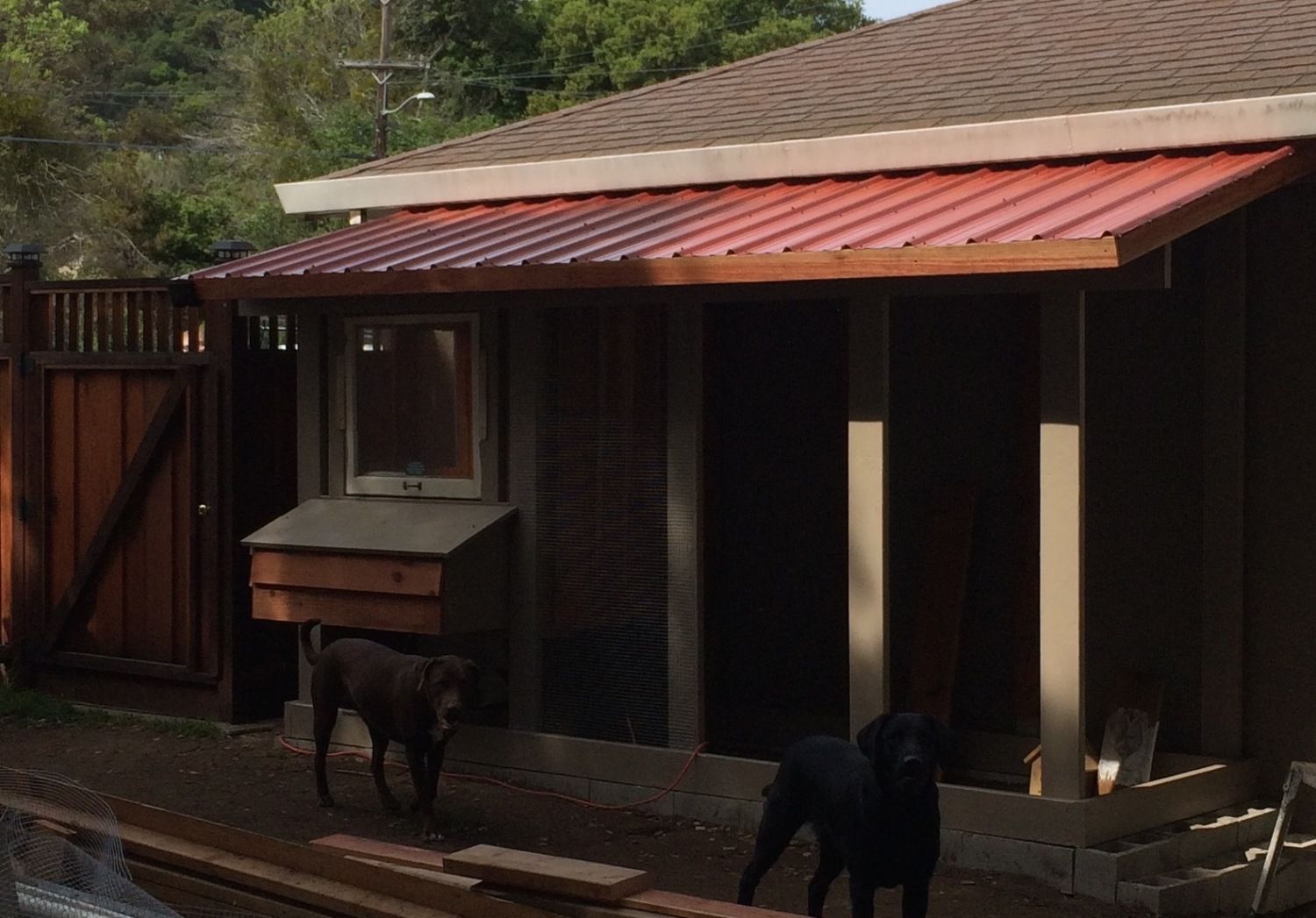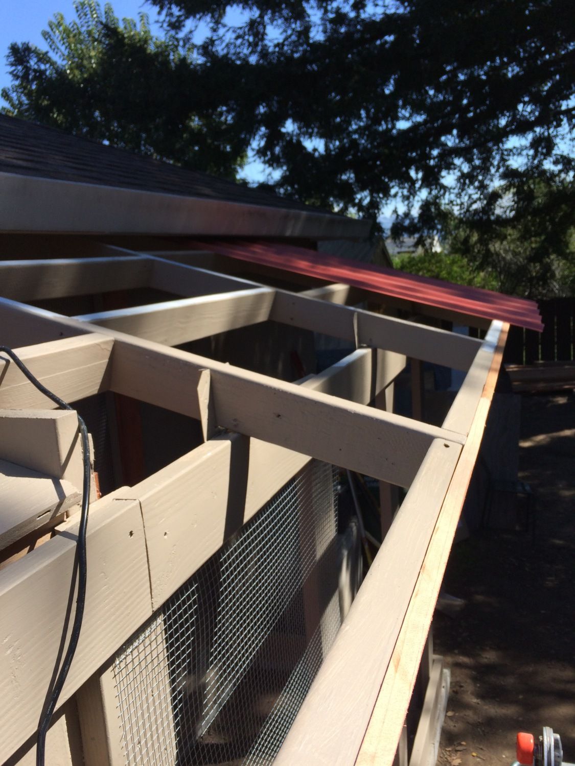 Roof framing is in place. I had a challenging time getting the pitch the same as the roof line but it worked out in the end. I special ordered red metal footing from Home Depot. One neat thing is they ship it with additional pieces to protect the top and bottom pieces so we ended up with a couple extra pieces. Maybe Sophie and Jamison will get dog houses soon.