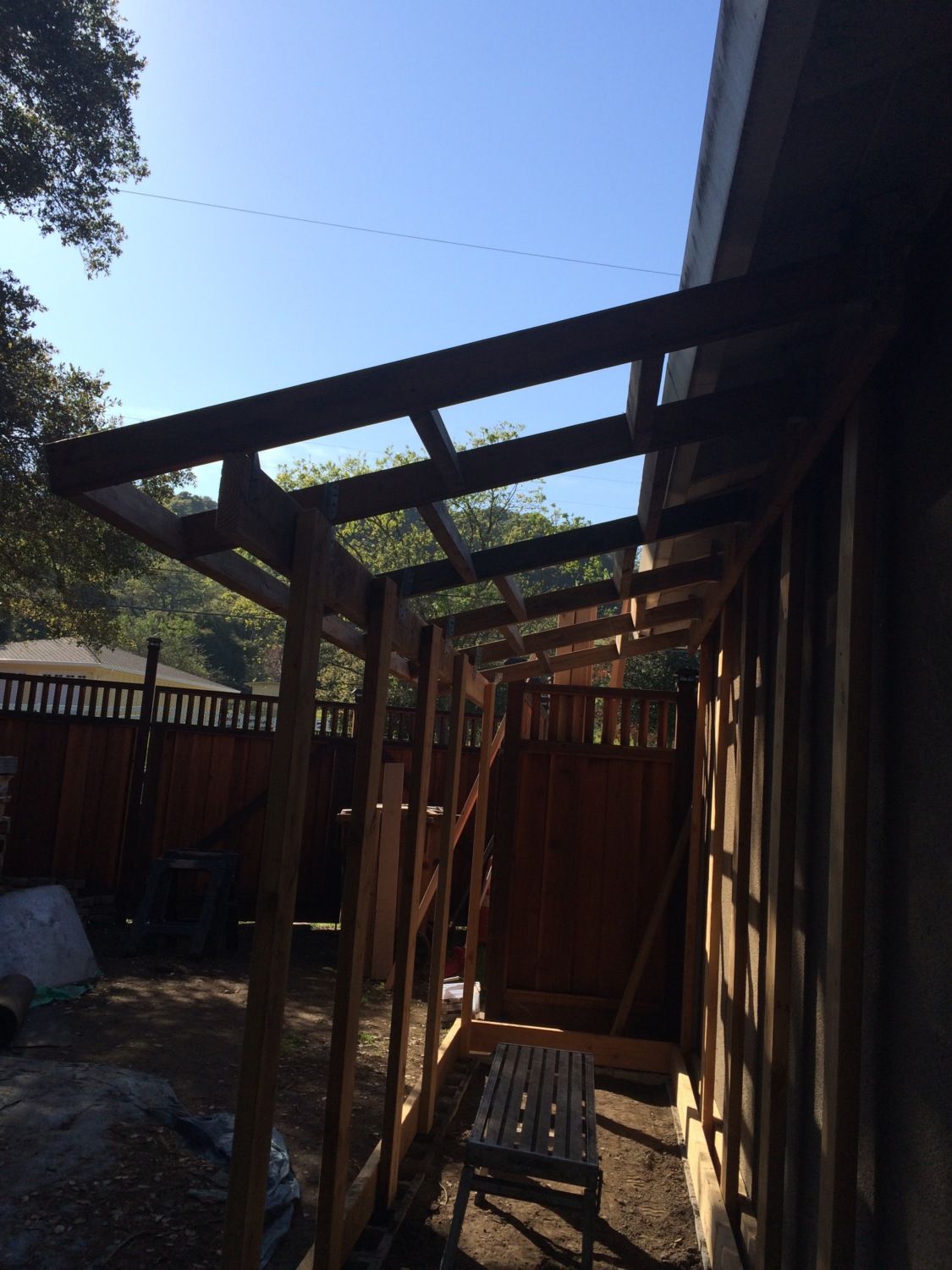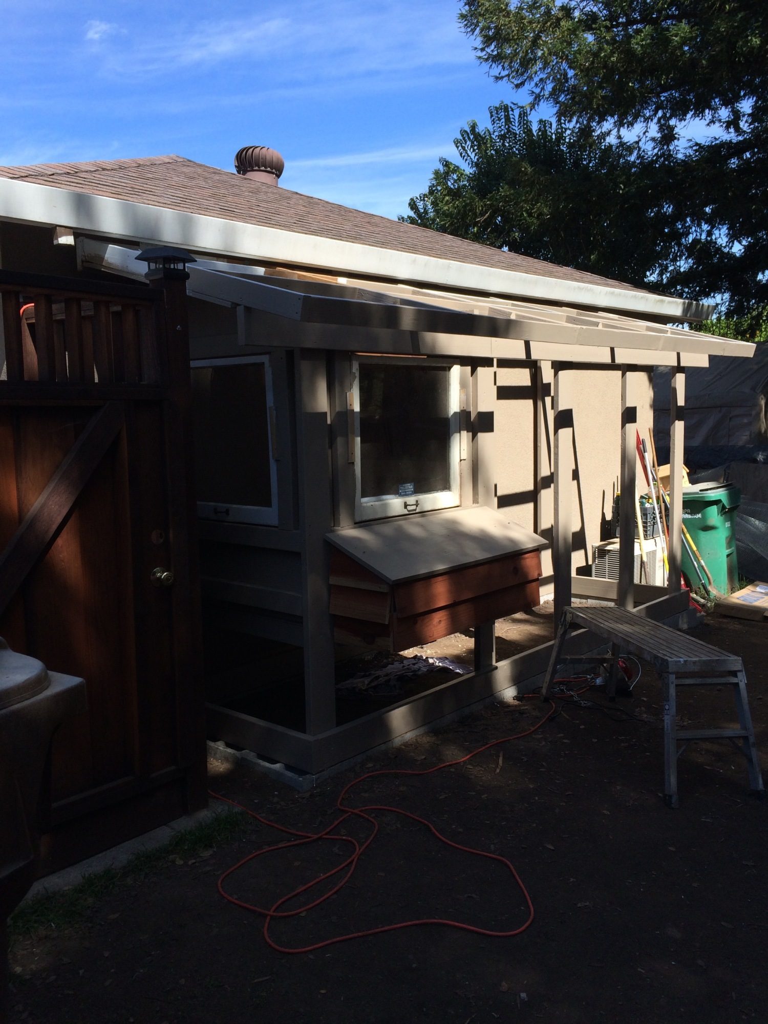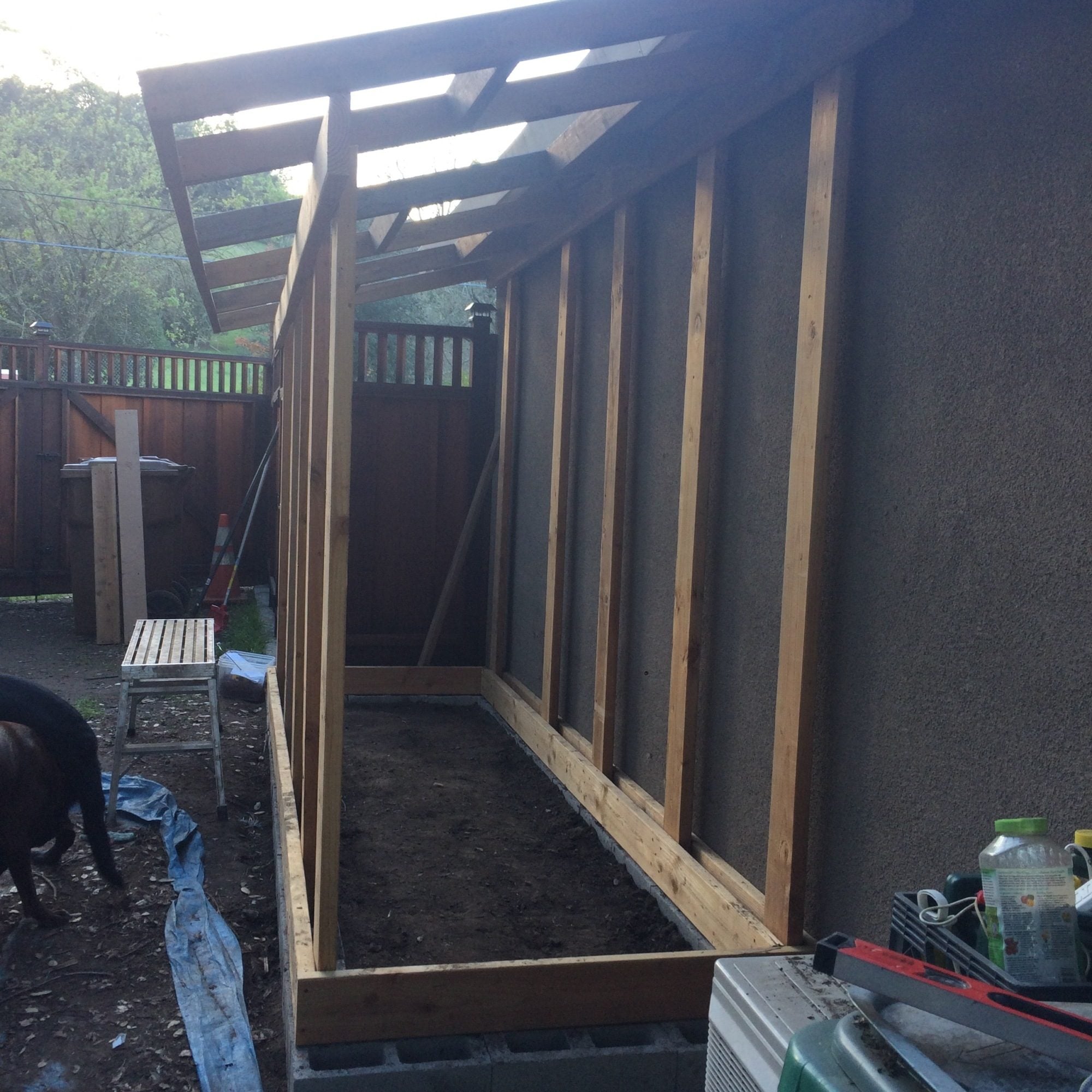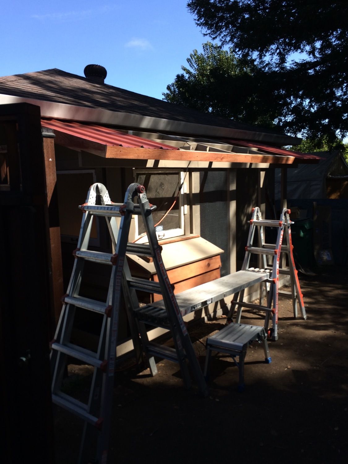 Roof framing is in place. I had a challenging time getting the pitch the same as the roof line but it worked out in the end. I special ordered red metal footing from Home Depot. One neat thing is they ship it with additional pieces to protect the top and bottom pieces so we ended up with a couple extra pieces. Maybe Sophie and Jamison will get dog houses soon.