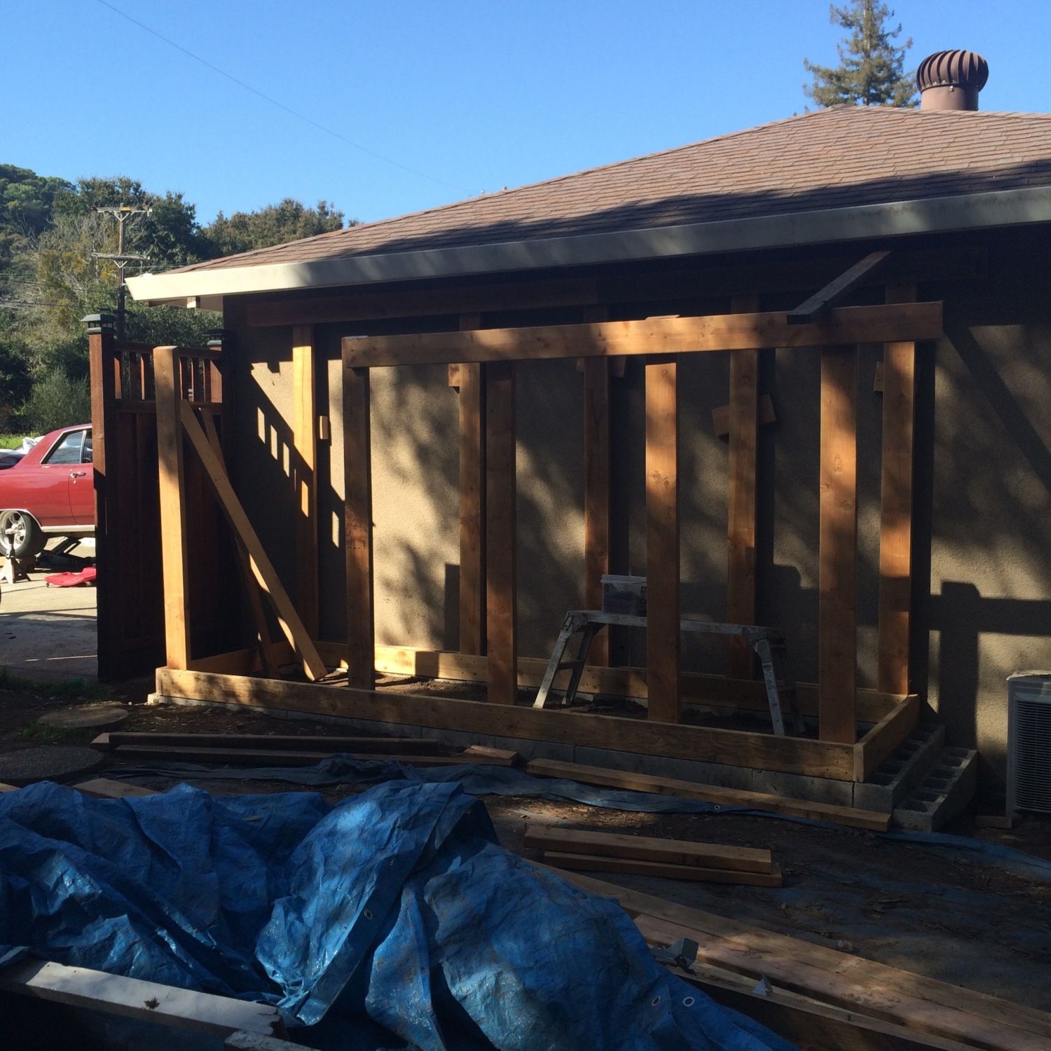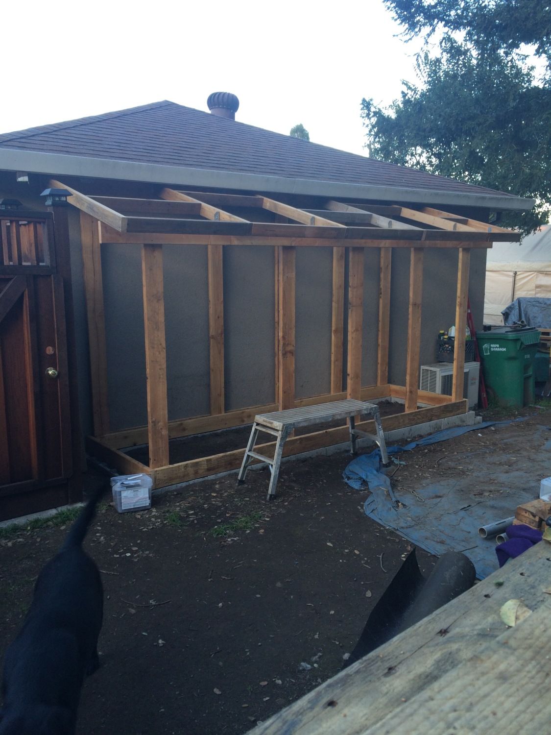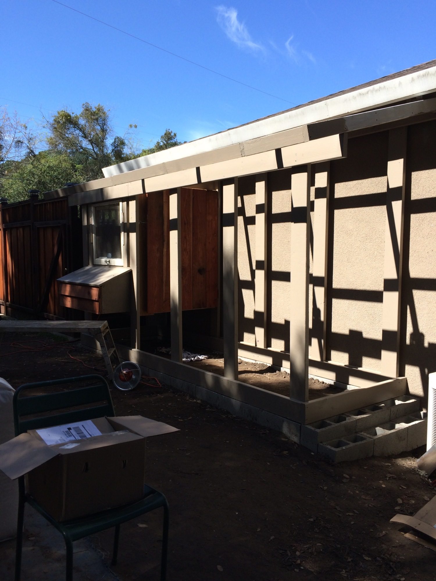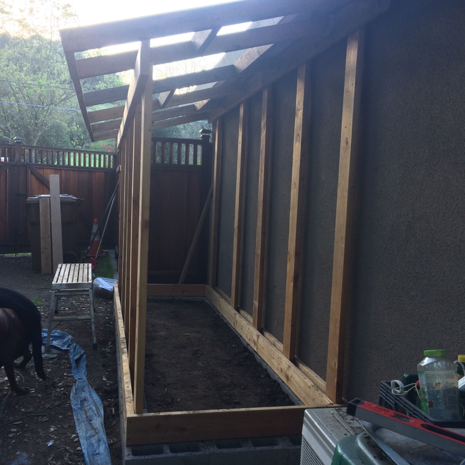 Roof framing is in place. I had a challenging time getting the pitch the same as the roof line but it worked out in the end. I special ordered red metal footing from Home Depot. One neat thing is they ship it with additional pieces to protect the top and bottom pieces so we ended up with a couple extra pieces. Maybe Sophie and Jamison will get dog houses soon.