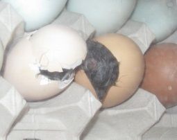 And the two blue eggs behind it are pipping right at this very moment... and they were expected to hatch this Thursday, so they are actually early!