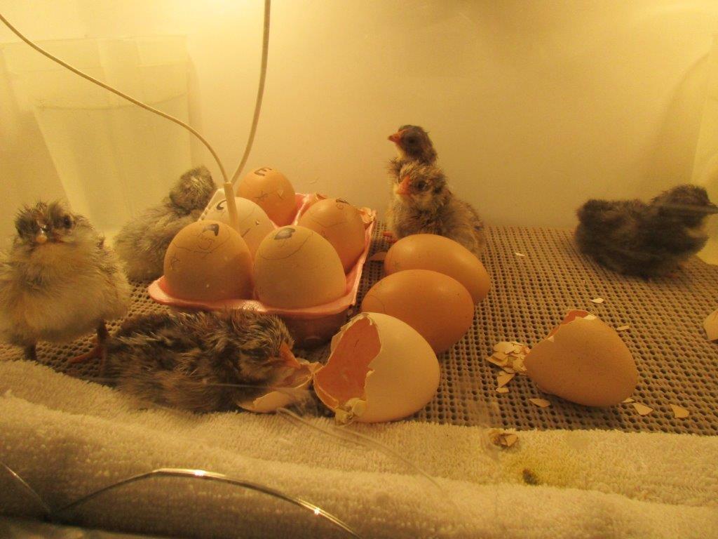 Had lots of excitement over the past few days. The quail hatched Tues-Wed and the chickens hatched Wed-Thurs (but 2 eggs are still peeping w/o external pips)