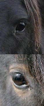 Black horse (top) with sun bleached mane compared against dark bay or seal brown horse (bottom) with reddish hairs around the eye.