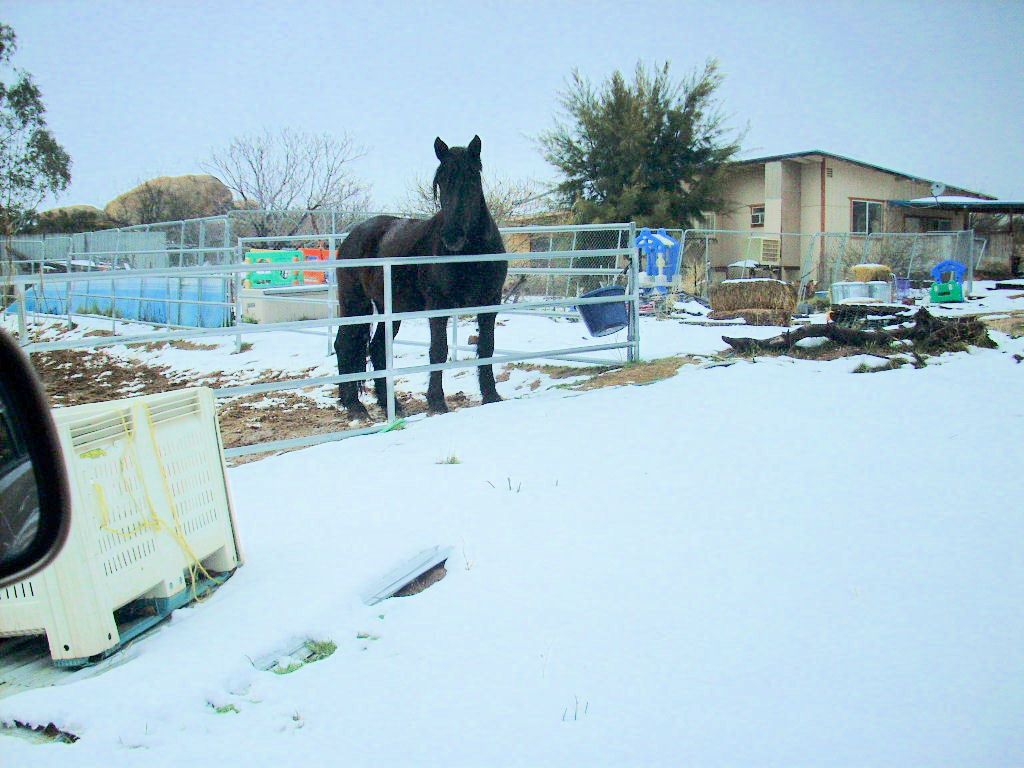 Snow yep... but as soon as the sun comes out its gone. Though the shady spots keep their snow for quite a few days. Most ever we had was about a foot. Crushed a bunch of lawn sheds and carports.... Katees first shelter too. It looked like a dead spider.... all flat with its metal legs sticking up.... Thank goodness Katee was living in town for a short time with Julie her one and only professional trainer. After the cart crash I got afraid of handling her and she spent two years without being touched up there.... so when I got a good job I brought her down to go to "camp" at a nice boarding place close to where Julie lives.
