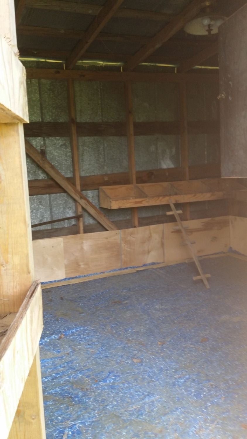 Inside the coop. They took the old pool liner and used it to cover the floor (no, our pool still doesn't have a liner lol). There's ONE lone roost just in the corner on the left of the image.