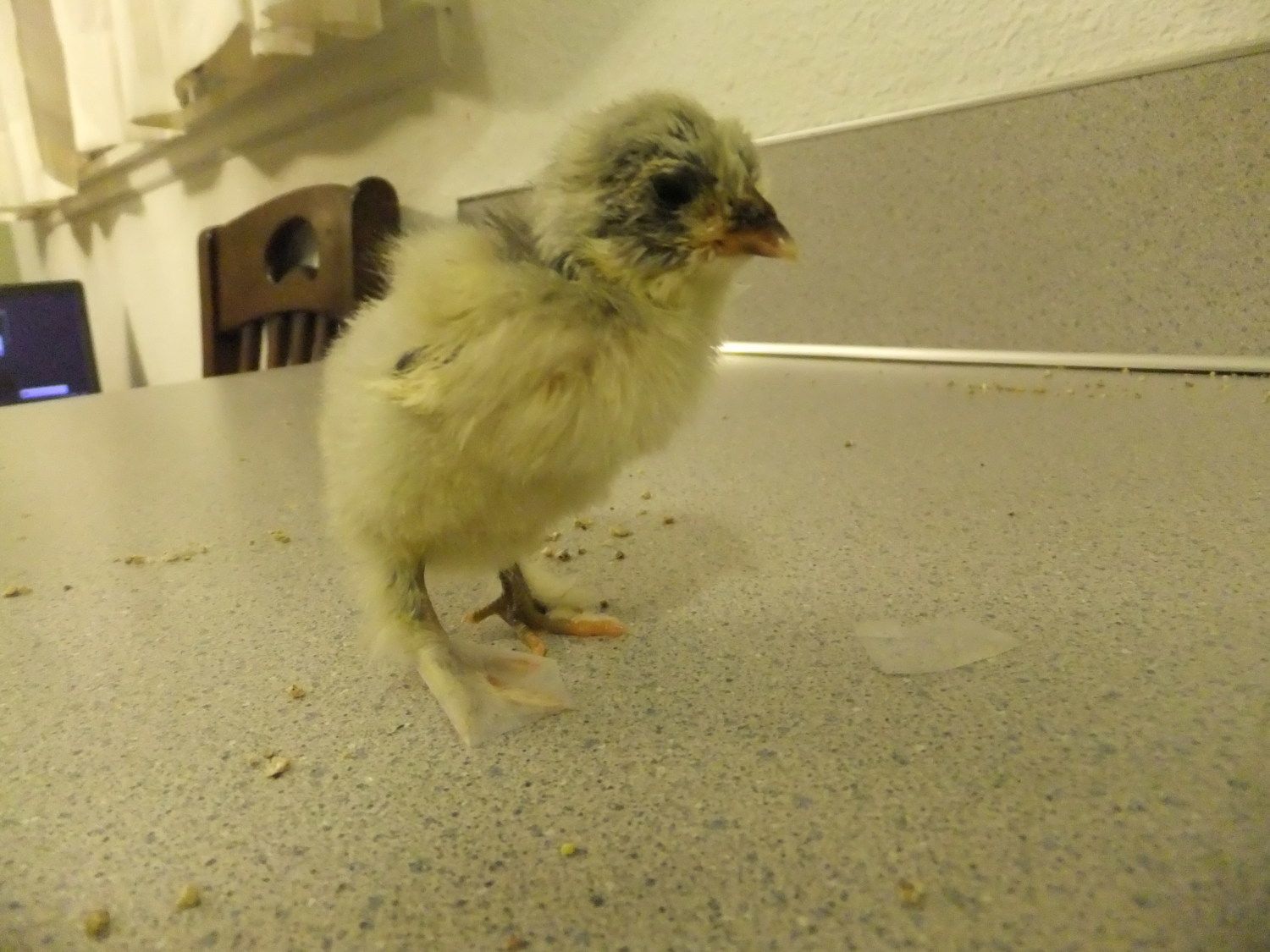 Tractor Supply they had little packets of Save-A-Chick to mix in the water for weak or slow starting chicks. I've used a syringe (the medicine kind without needles) to give chicks tiny droplets of water, just be careful not to squirt too much, they'll drink it if you do this unless they are close to death. I've always been told you'll die from lack of water before food so maybe sugared water will make her perk up & eat. I hope she turns around for you, they're all so cute! It looks like their boots are working to, it took me forever to do that to a quail chick & yours/sixpugs look wayyy better lol.