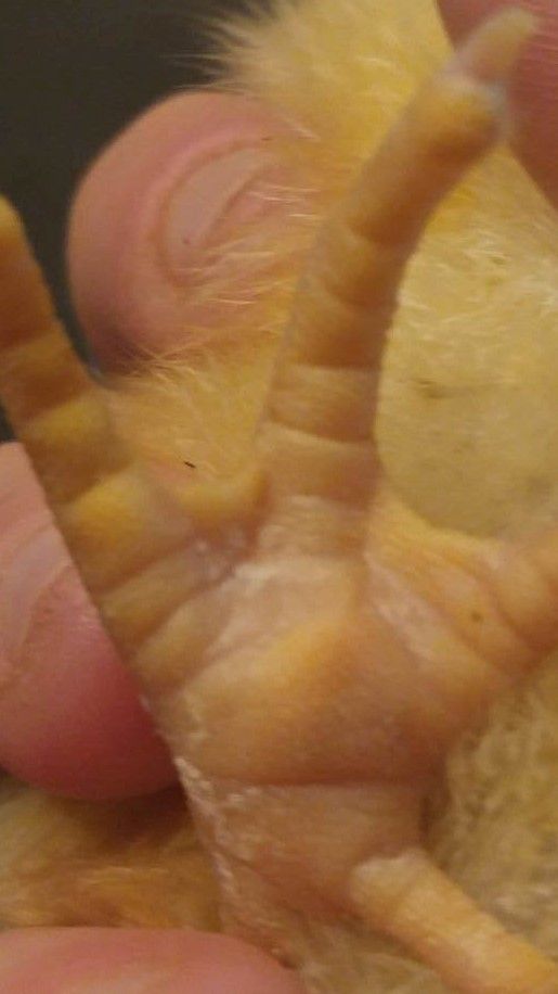 What may have happened is that the bone or tendon in its leg may be torn/fractured/broken. This is usually caused by trauma, and being it is a TSC chick, it most definately shipped, which is where many chicks get injured.