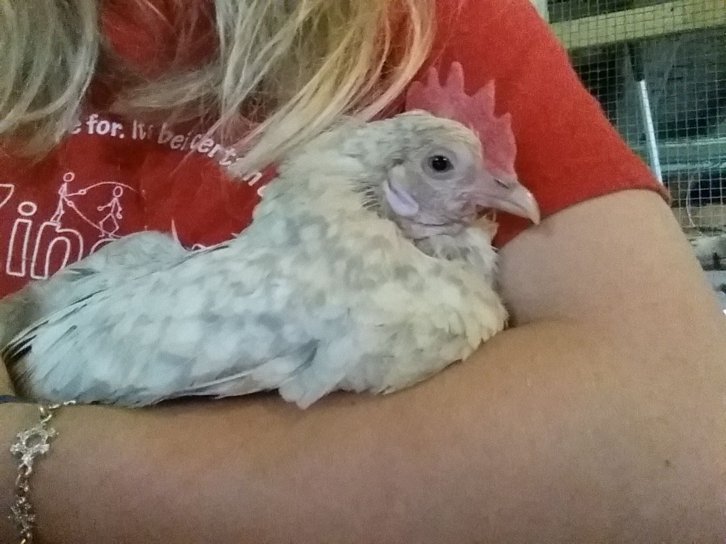 Awh! I rescued a breeding hen in the spring time. She was at the chillicothe swap meet and some guy had her in a cage with 4 rooster that were stepping on her. You could not see her at all from the side walk. I heard her and I rushed over to her sound and told the guy "I WANT HER" He said 15 dollars, and I told him " $10 and thats it". He gave her to me for $10 and my mom was mad that we got her for 10 cause she was not worth it. I held her so close to me and she was so happy! We never caged her on the way home, she just sat on my lap. When we got home, i let her on grass and she fallowed me EVERYWHERE! I rescue roosters and this was my first Hen rescue. Now you may think that this is not a rescue. Well if you saw her you would be like omg...what did he do to her? She has stunned growth in her chest feathers and wont grow any beard feathers. She went passed a roosters cage and she just pent over like she is used to it. I felt so bad and I promise you will never be breed. She is my most spoiled Hen ever. I always let her go where she wants to go and I cant ever cage her because she has anxiety. When we move into our own house, she will live inside with us. She is just so sweet and loves attention. Now I have my own breeding pair. names are Percilla and Dude, But! If I separate them, they freak out and go crazy. My hen wont lay eggs unless she is alone with him and no other hen or rooster is there. I call them my married couple. I tried giving her a break but that didnt work out too well... You can rescue a hen, and that hen is your world. For that single Hen, she believes in you. weither she was breed, Abused, raised wrong, or was fought, She think you are her world. Here is her, she is a porcelain bearded D'uccle and her name is Lady. This is the first day we got her. first time out. Lady today