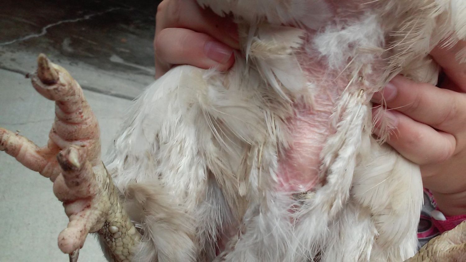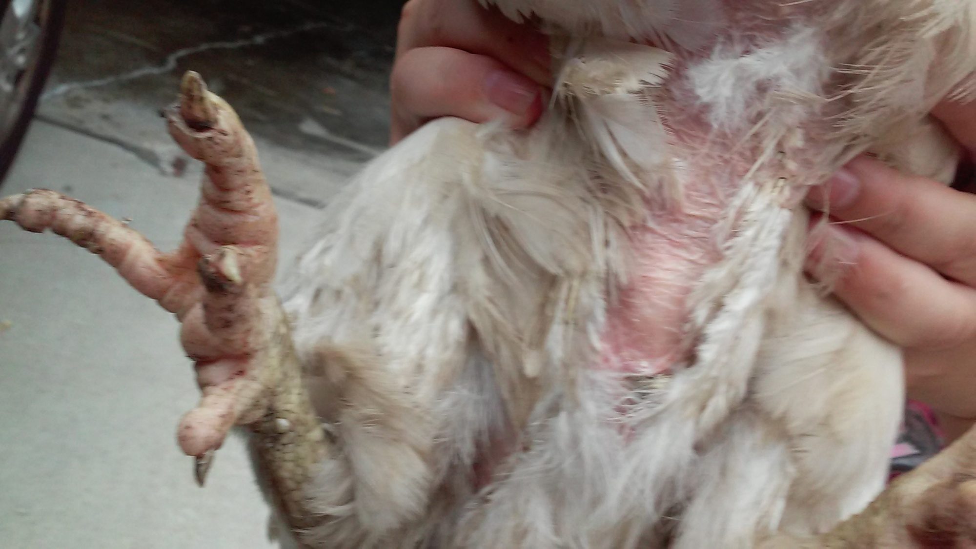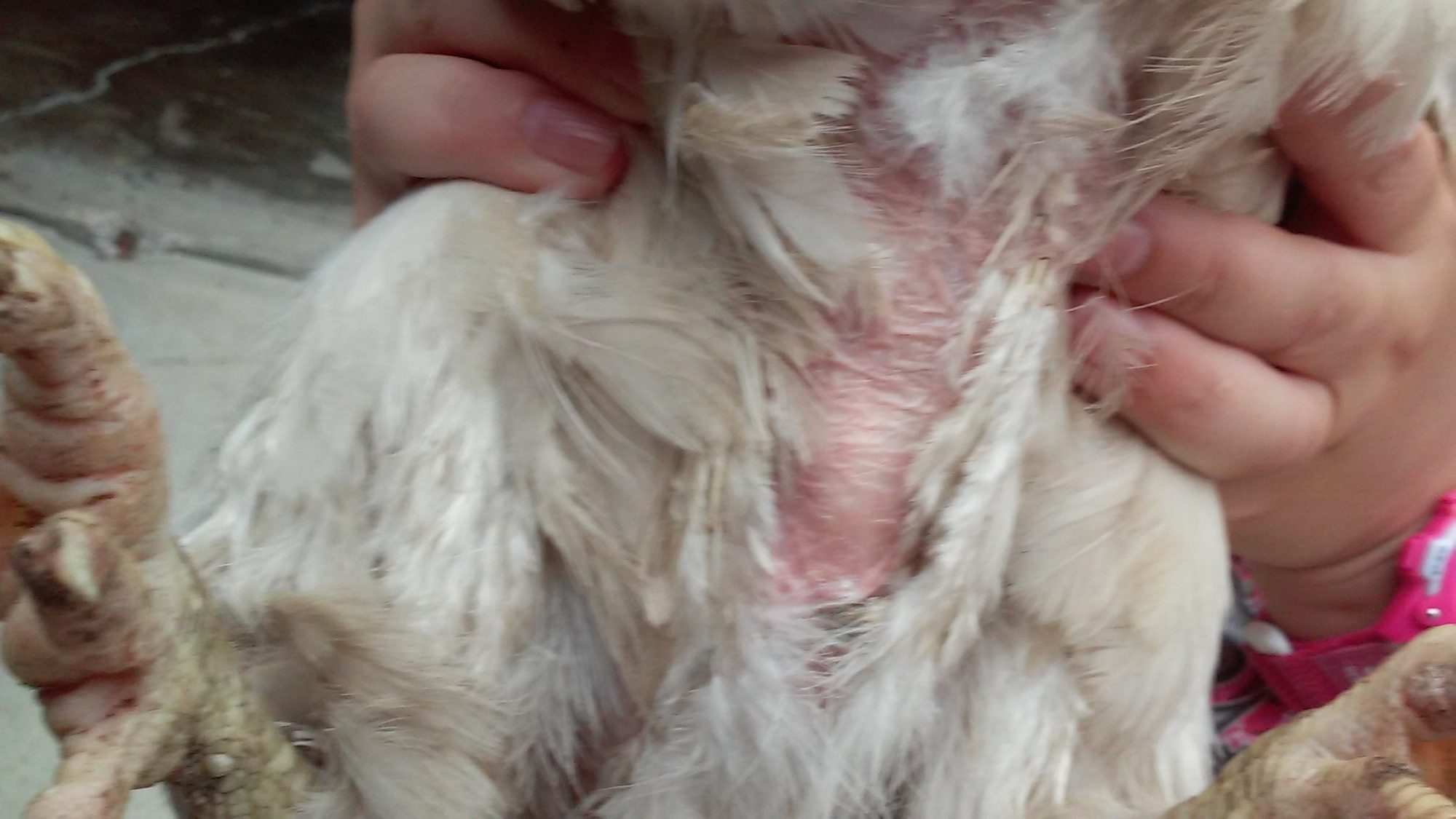 She is missing feathers on her belly, but I see no signs of mites. Her feet are in bad shape. Missing a few two nails (but not apparently a recent injury) and toes seem to be swollen or misshapen. She is nearly bald on the top of her head.