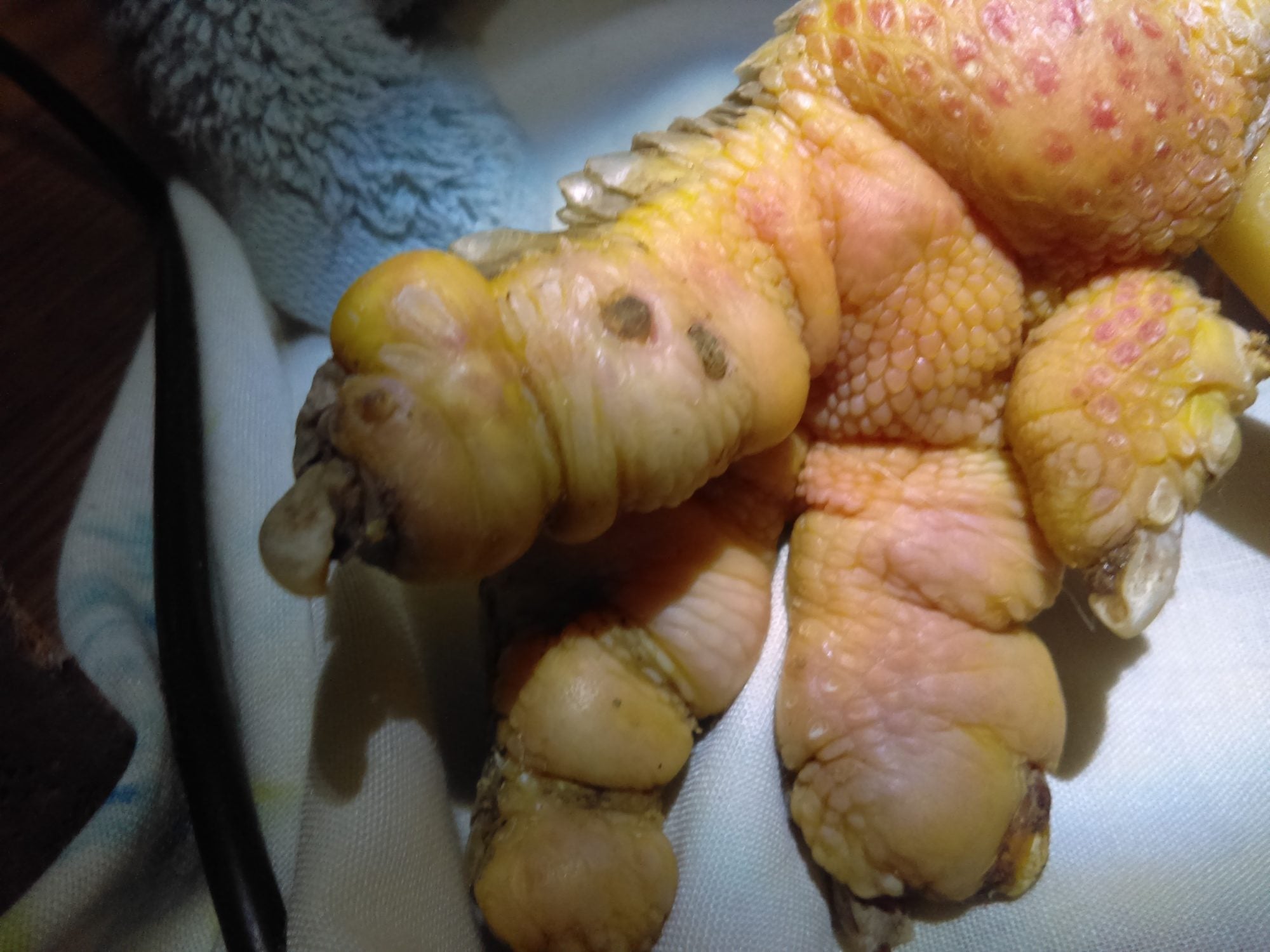 I've never had to deal with bumblefoot before, which is odd considering how long I've raised birds. Both his feet are horribly swollen even the toes and while I haven't managed to clean off the bottoms of his feet to get any helpful pics, I do have a pic of each foot from the top, Which I'll try and post below. (Note, I'll try to get his feet cleaned and pic taken tonight after dark when I can actually catch him..)