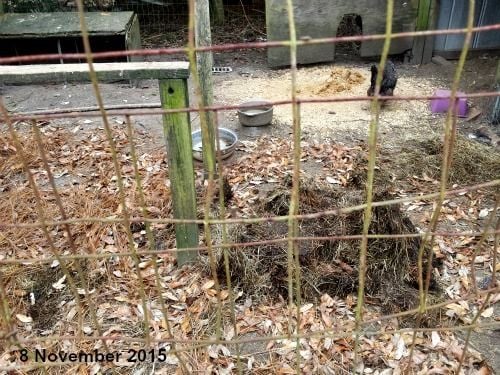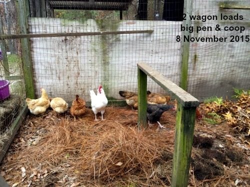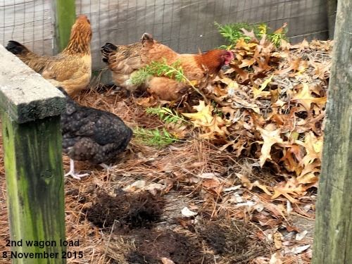 After two weeks of being sick w/ cold/flu (still having drainage and coughing), I finally managed to get each of our chicken areas at least 2 "wagon" or 2 32 gallon trashcan loads of mixed pine straw, hay & leaves. The largest coop/run actually has 3 wagon loads in the run so far and 1- 32 gallon trash can full in the coop area. It also got a 1 yr old bale of hay (already 1/2 decomposed) spread out & mixed w/ the loads...